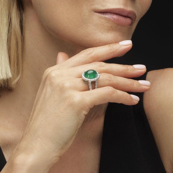 171. *Bague sertie d'une émeraude taille cabochon ovale (env. 8 ct) entourée et épaulée de diamants (env. 1 ct)