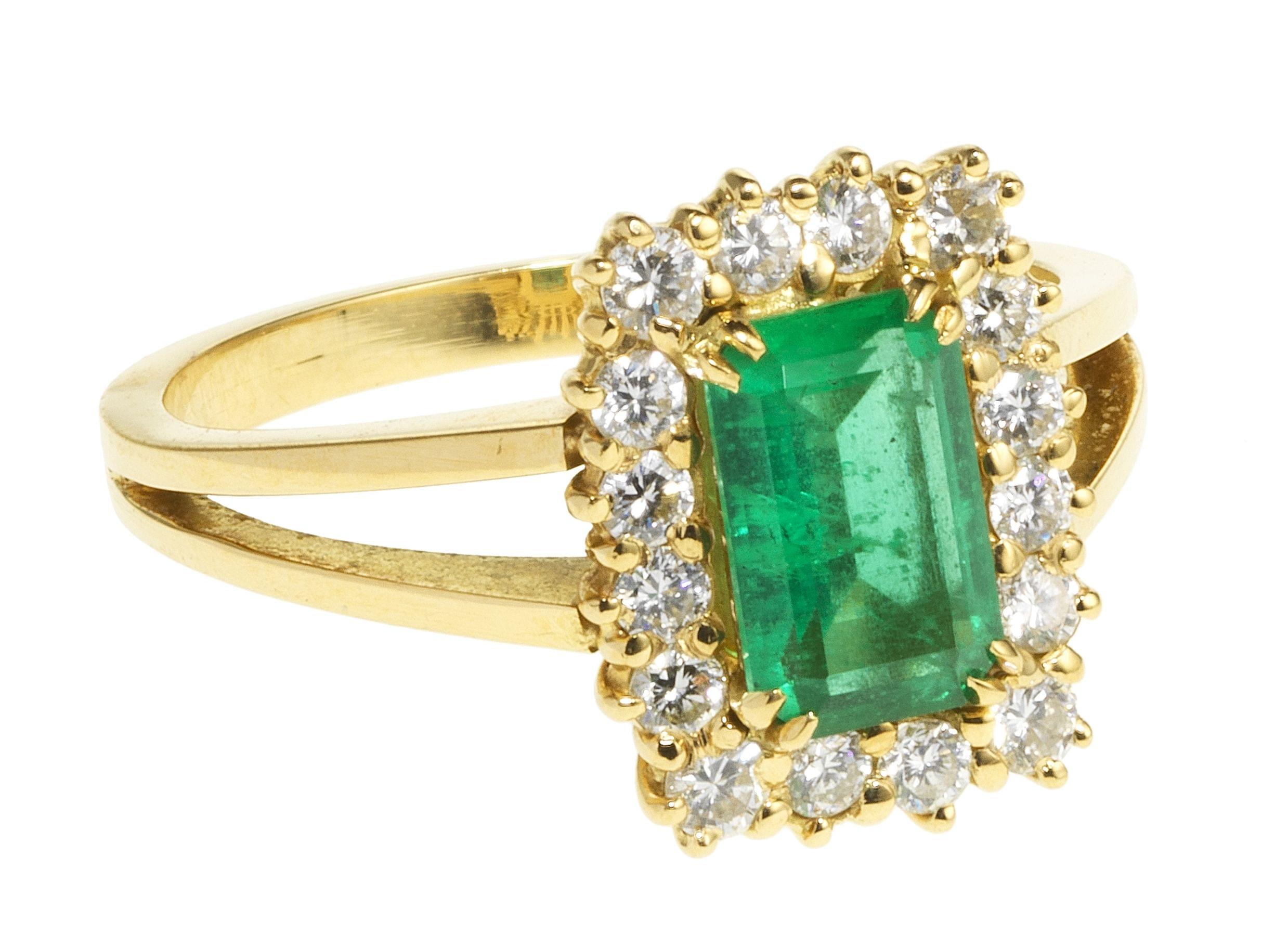 3318. Bague sertie d'une émeraude taille émeraude (env. 1 ct) entourée de diamants (env. 0,45 ct)