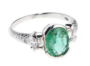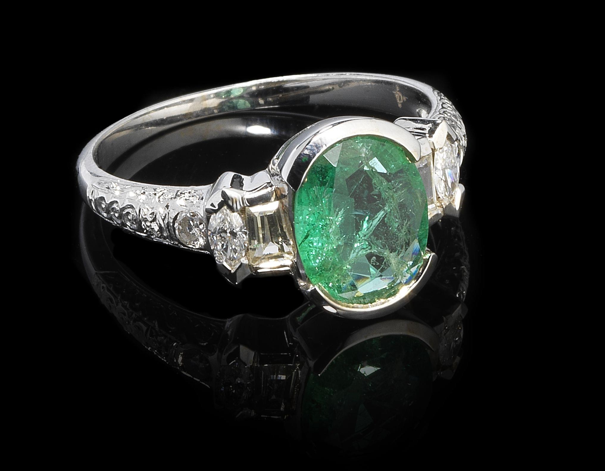 3316. *Bague sertie d'une émeraude taille ovale (env. 1 ct) épaulée de diamants taille baguette, marquise et brillant (env. 0,2 ct)