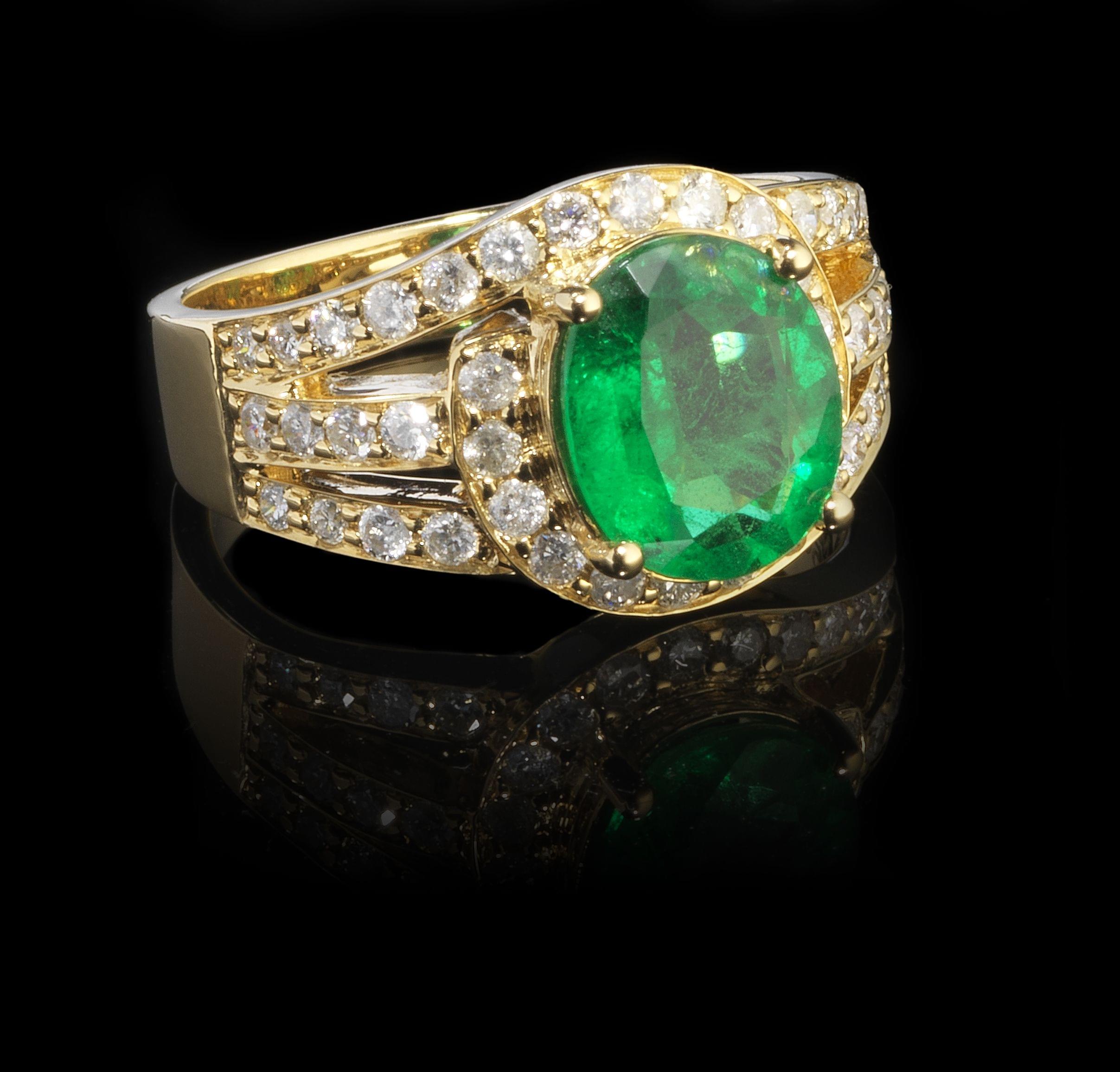 3529. Bague sertie d'une émeraude taille ovale (env. 1,7 ct) sur une monture pavée de diamants (total env. 0,5 ct)