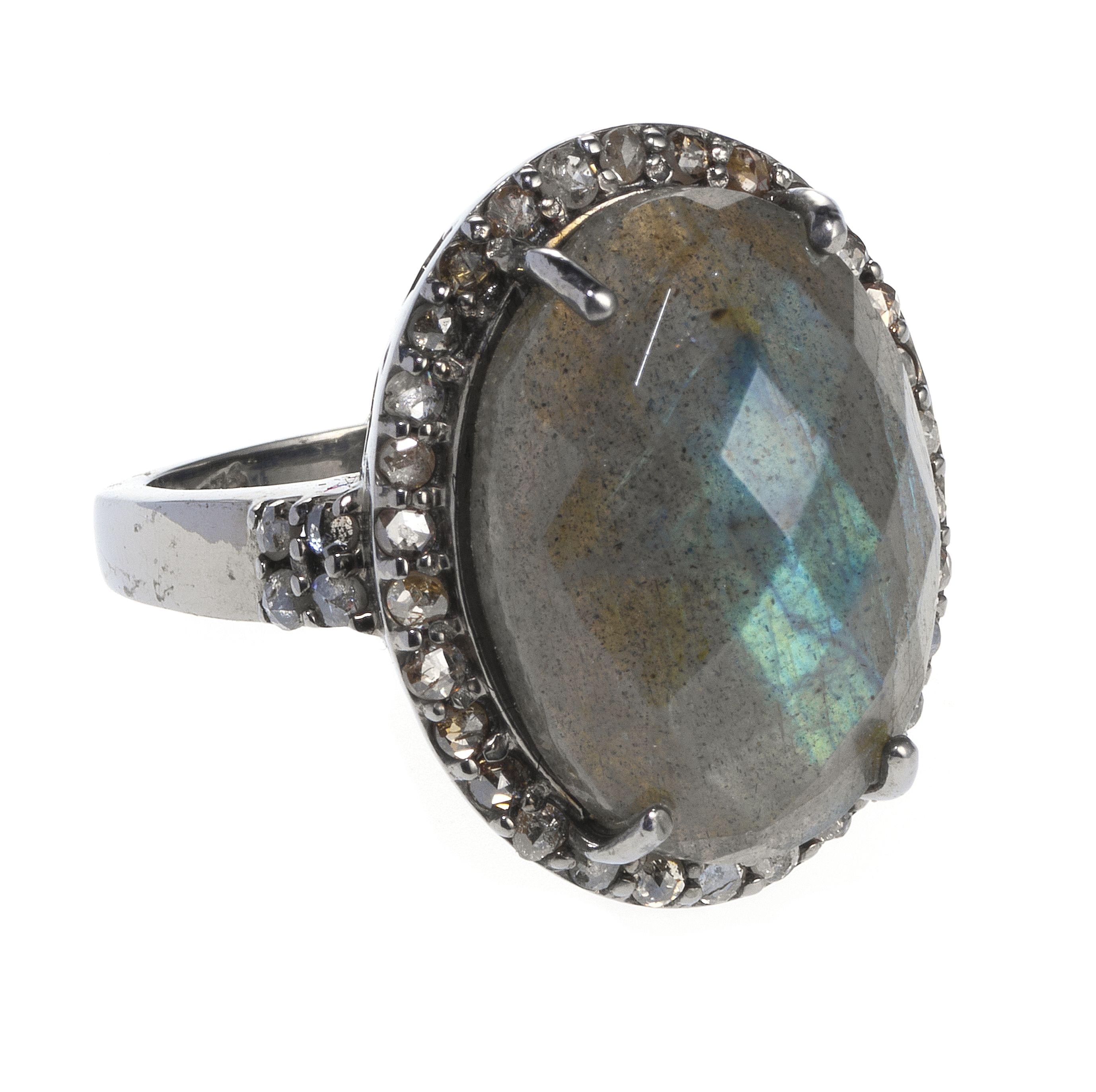 3089. *Bague sertie d'une labradorite facettée entourée de roses de diamant