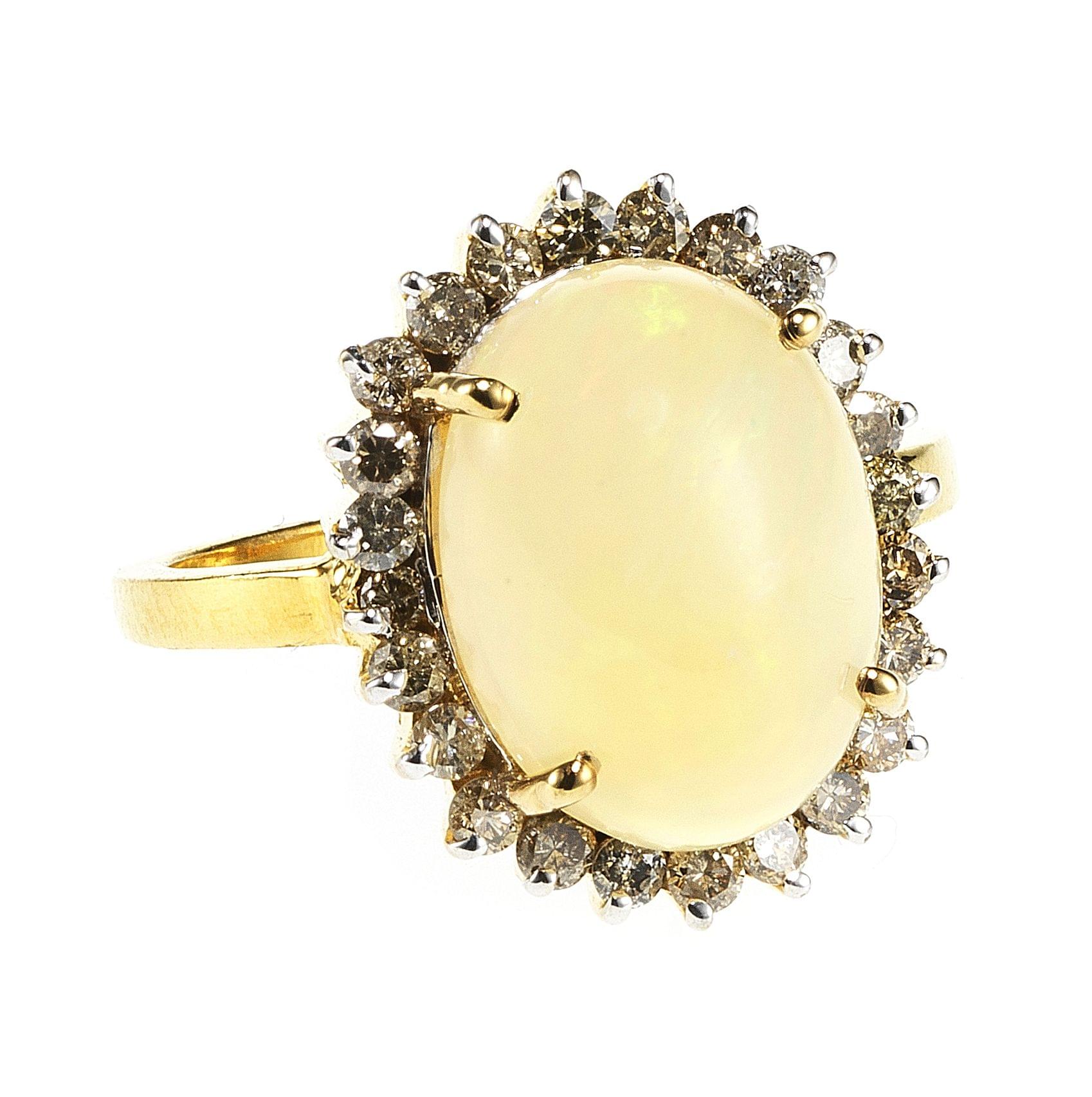 3237. *Bague sertie d'une opale à fond blanc taille cabochon (4,02 ct) entourée de diamants champagne
