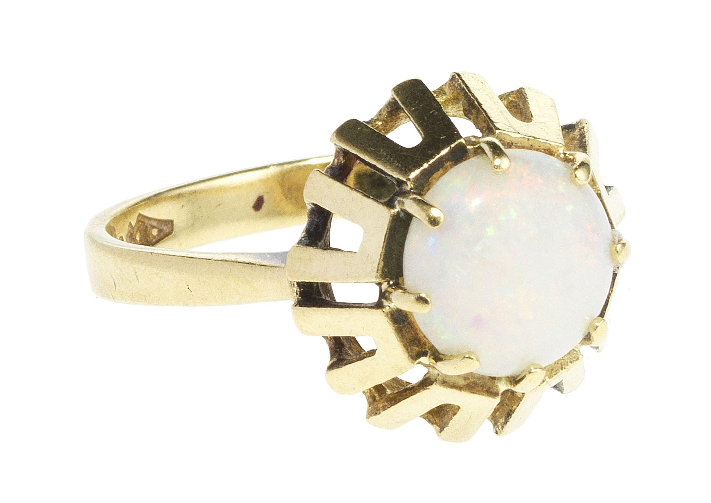 3056. Bague sertie d'une opale à fond blanc taille cabochon