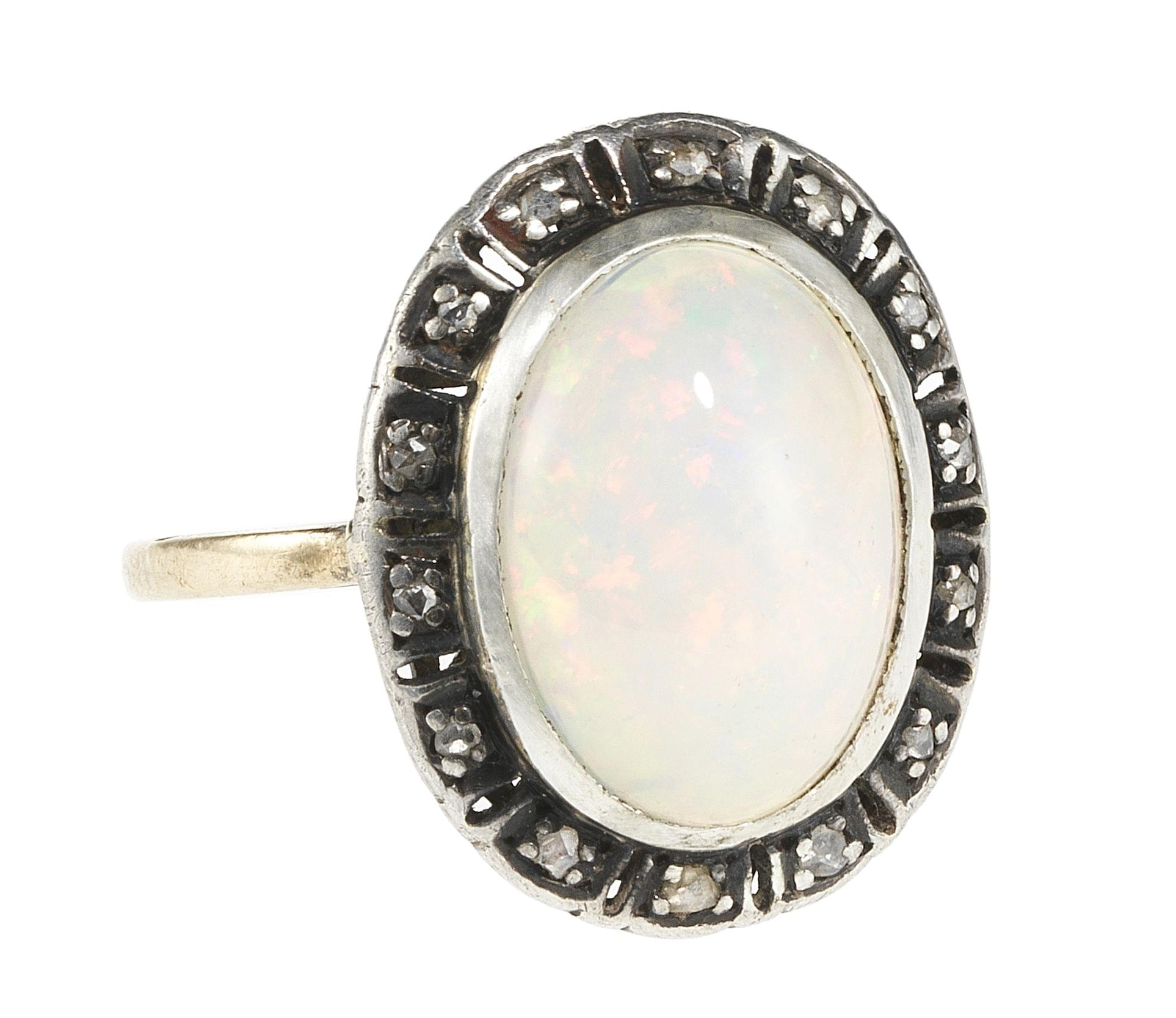 3262. Bague sertie d'une opale à fond blanc taille cabochon ovale entourée de roses de diamant