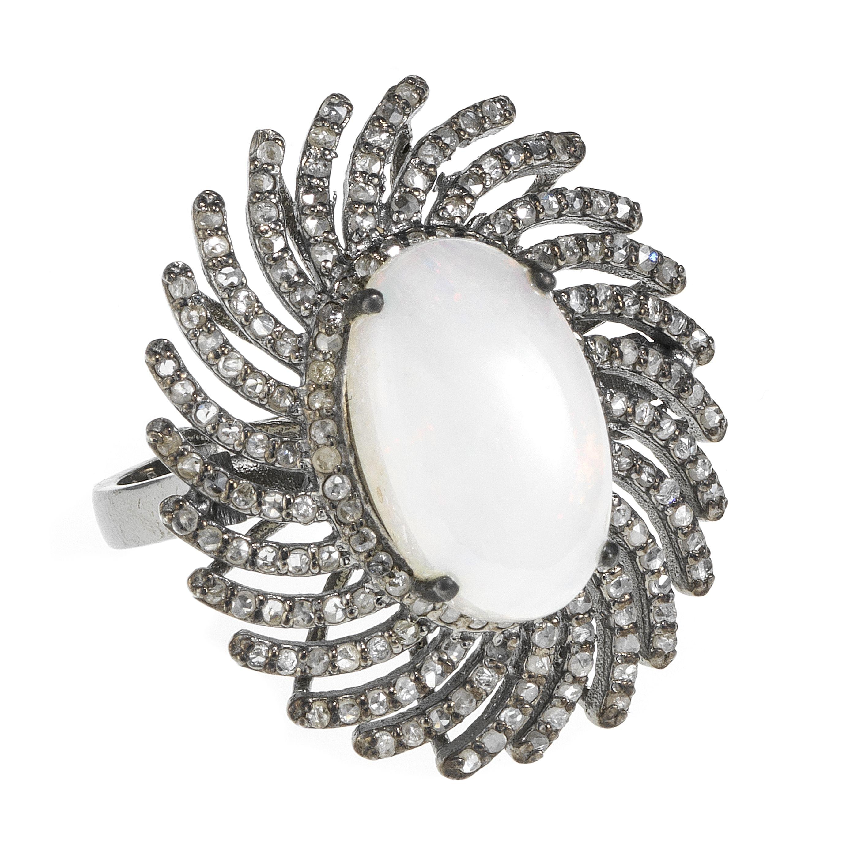 3216. *Bague sertie d'une opale à fond blanc taille ovale cabochon (env. 2 ct) sur une monture pavée de roses de diamants