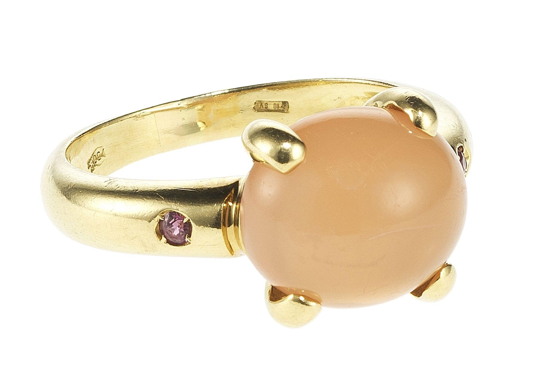 3170. Bague sertie d'une opale taille cabochon épaulée de deux petites rhodolites