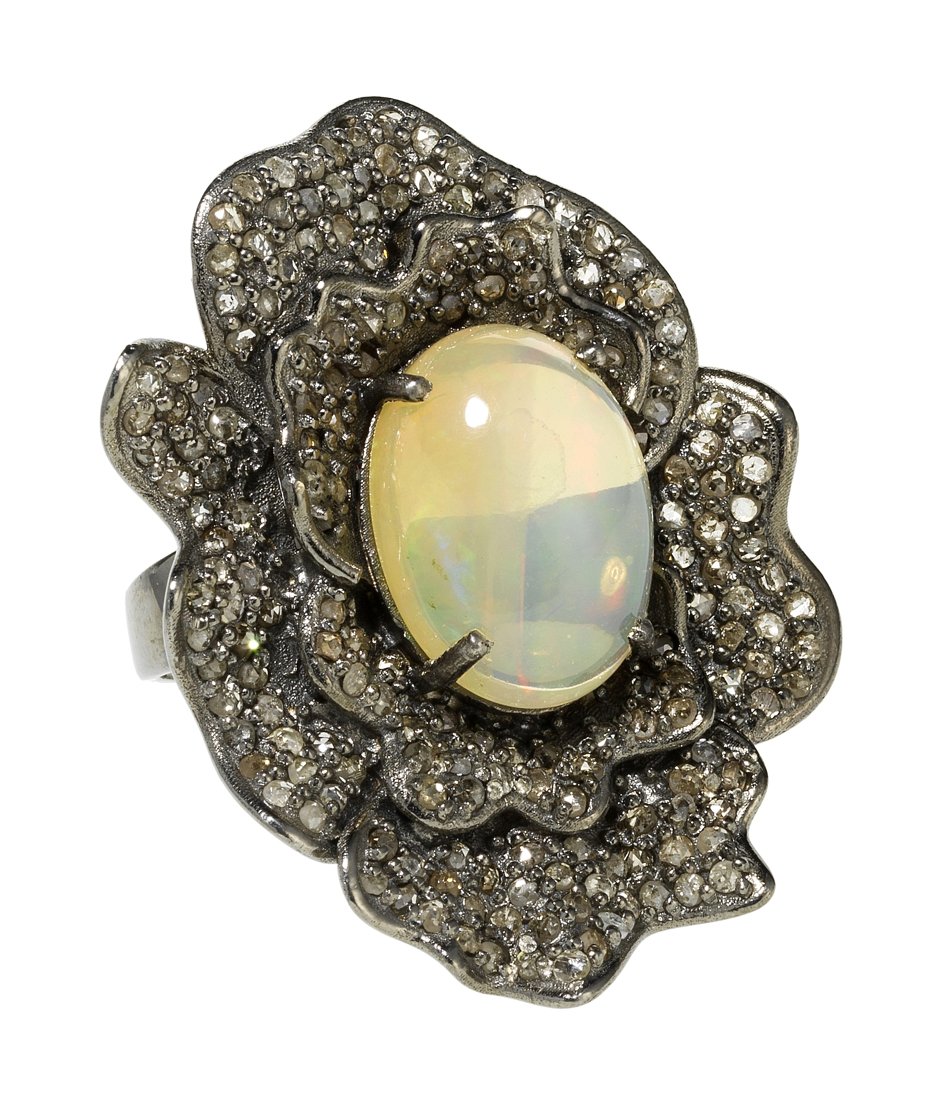 Dans une monture fleur pavée de roses de diamant, argent noirci 925, doigt 55-15. Pour les lots précédés d'un *, la TVA de 7,7% est due sur l'entier du prix d'adjudication.