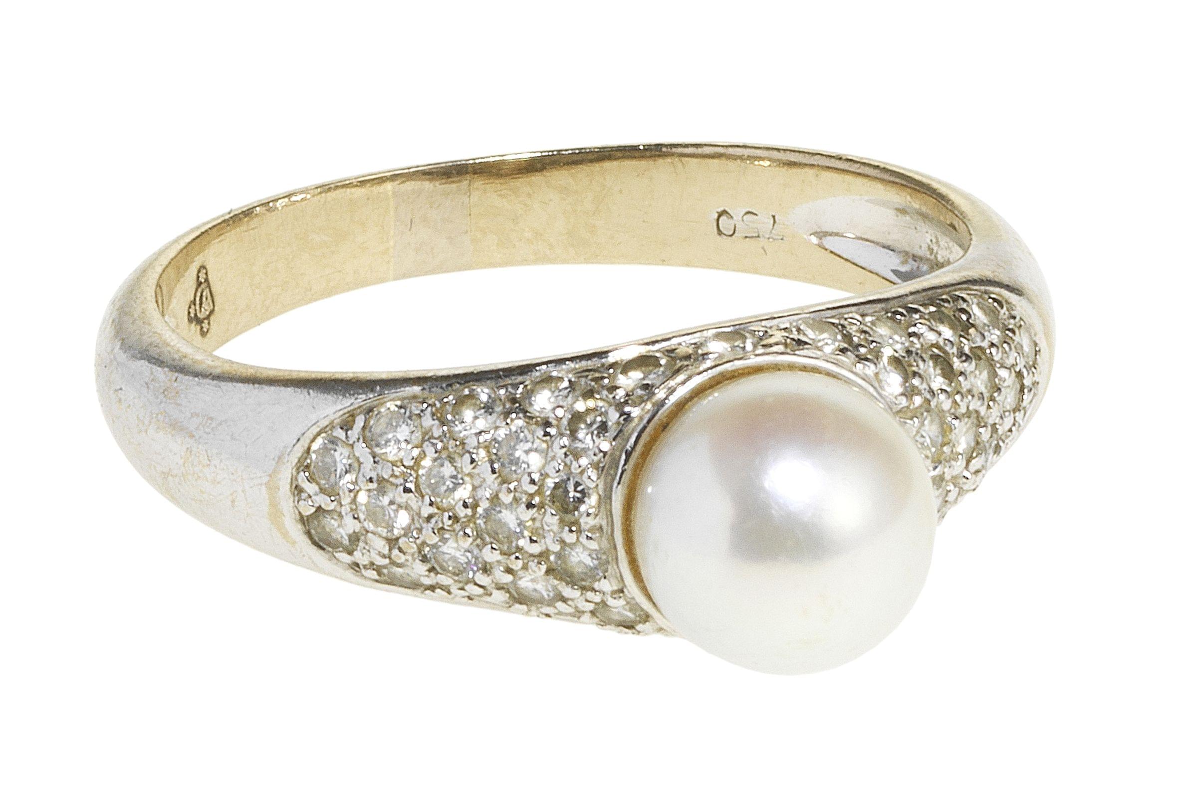 3342. *Bague sertie d'une perle (D env. 6,5 mm) dans un pavage de diamants