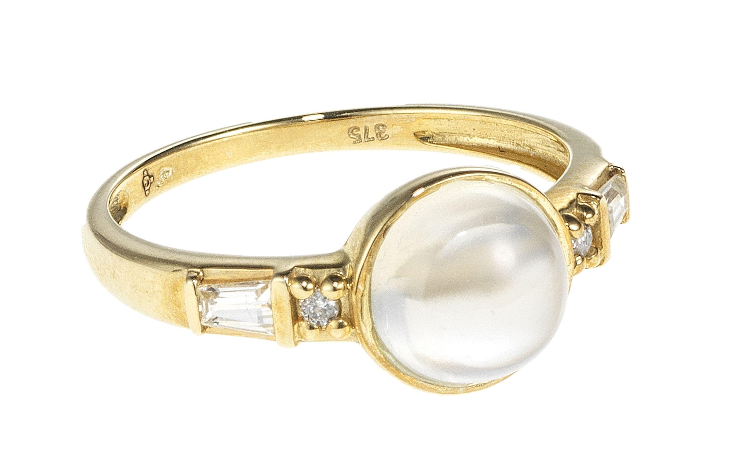 3155. *Bague sertie d'une pierre de lune taille cabochon ronde épaulée de diamants taille brillant et trapèze