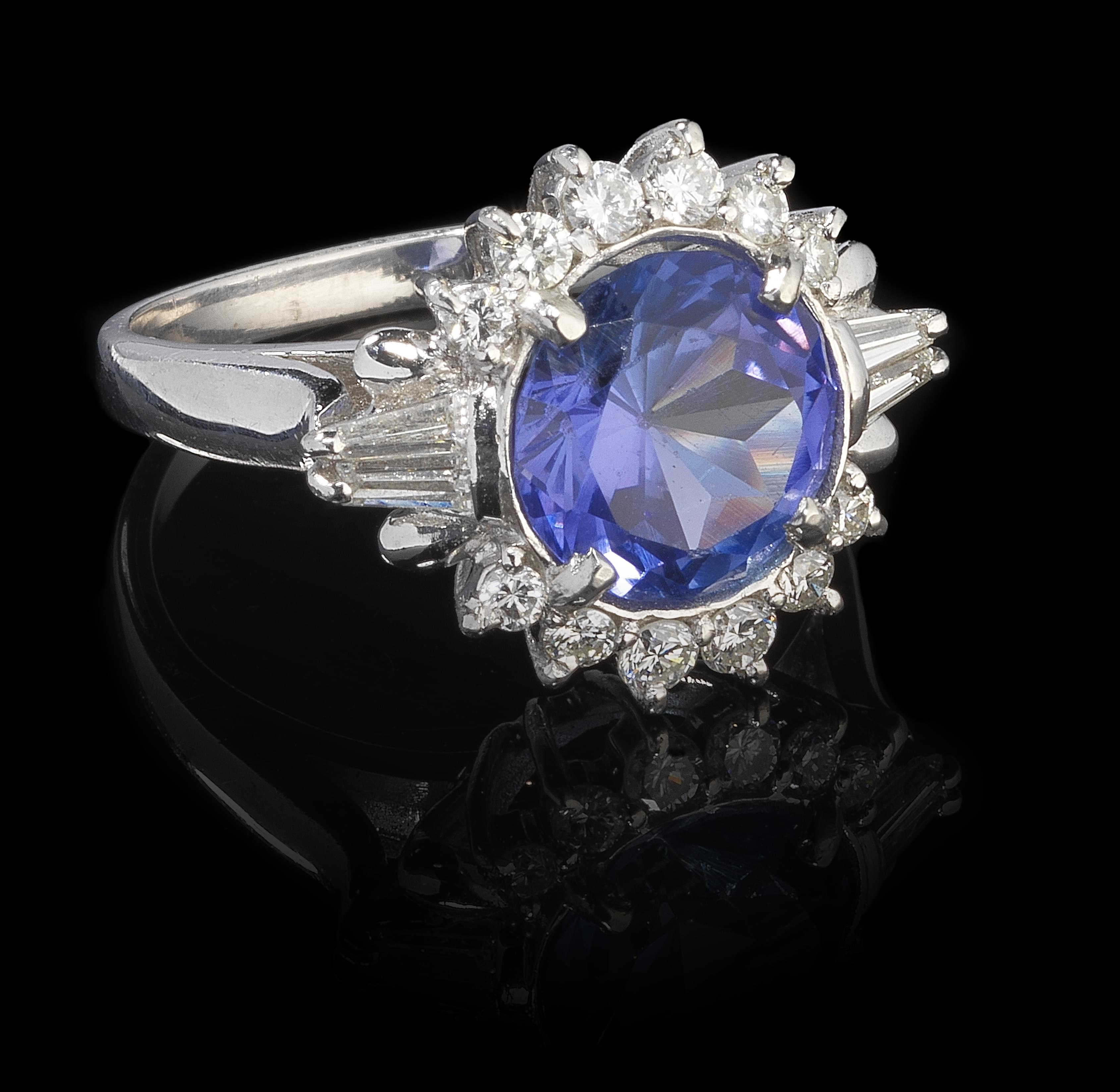 72. *Bague sertie d'une tanzanite taille brillant (2,92 ct) entourée de diamants taille brillant et trapèze (0,58 ct)