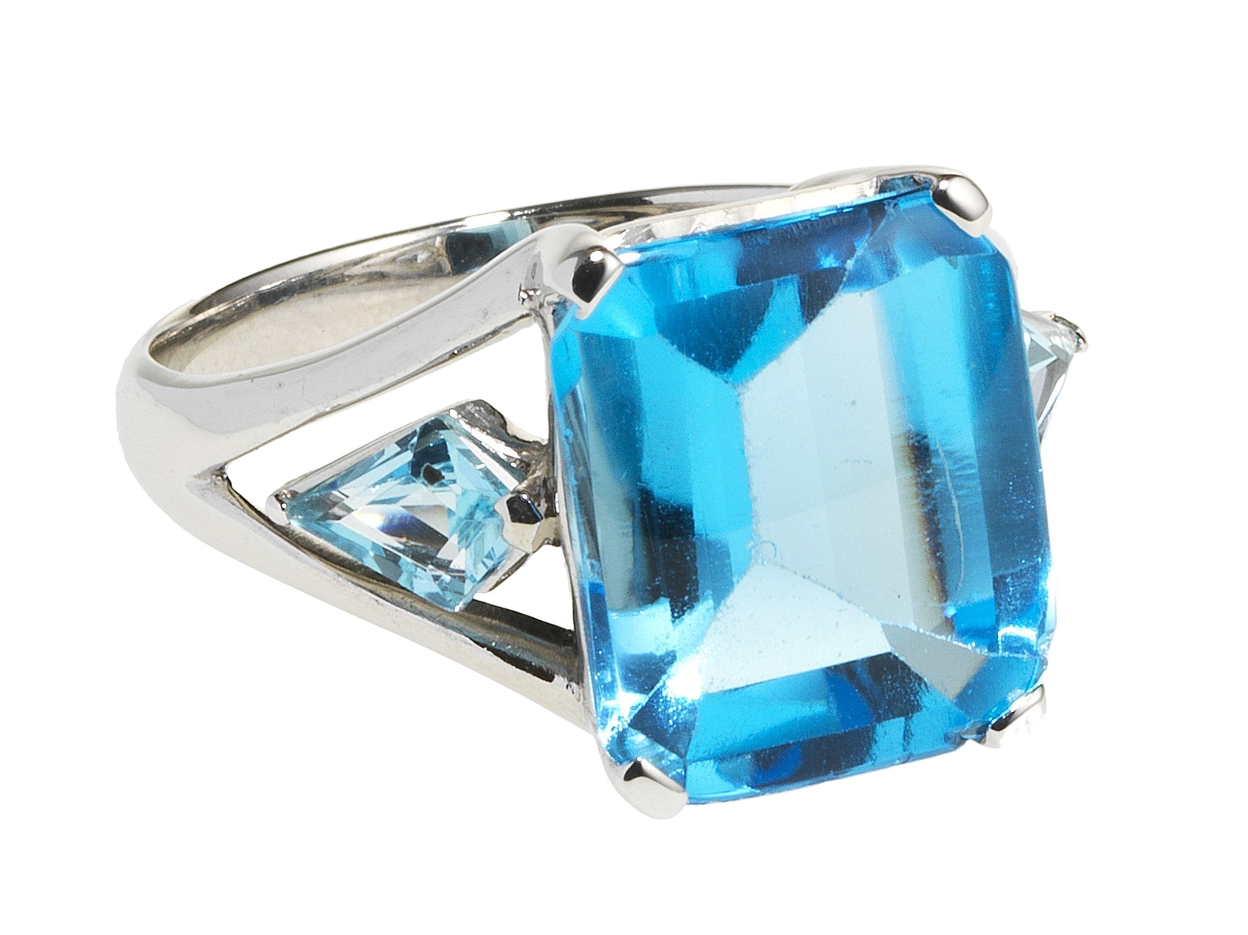 3226. *Bague sertie d'une topaze bleue suiffée (env. 6 ct) épaulée de topazes bleues taille fantaisie