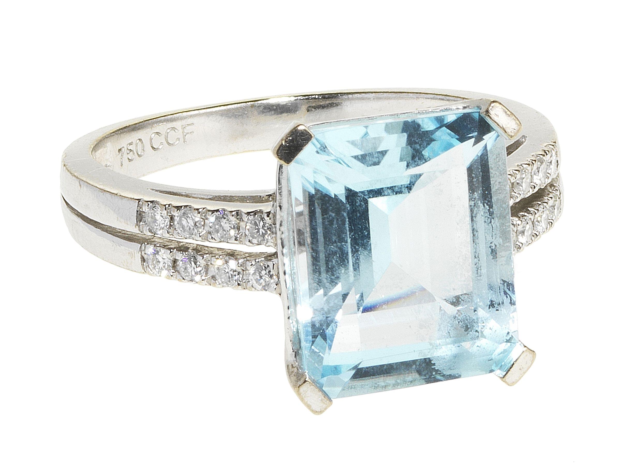 3007. Bague sertie d'une topaze bleue taille émeraude (env. 4,5 ct) épaulée de deux lignes de diamants