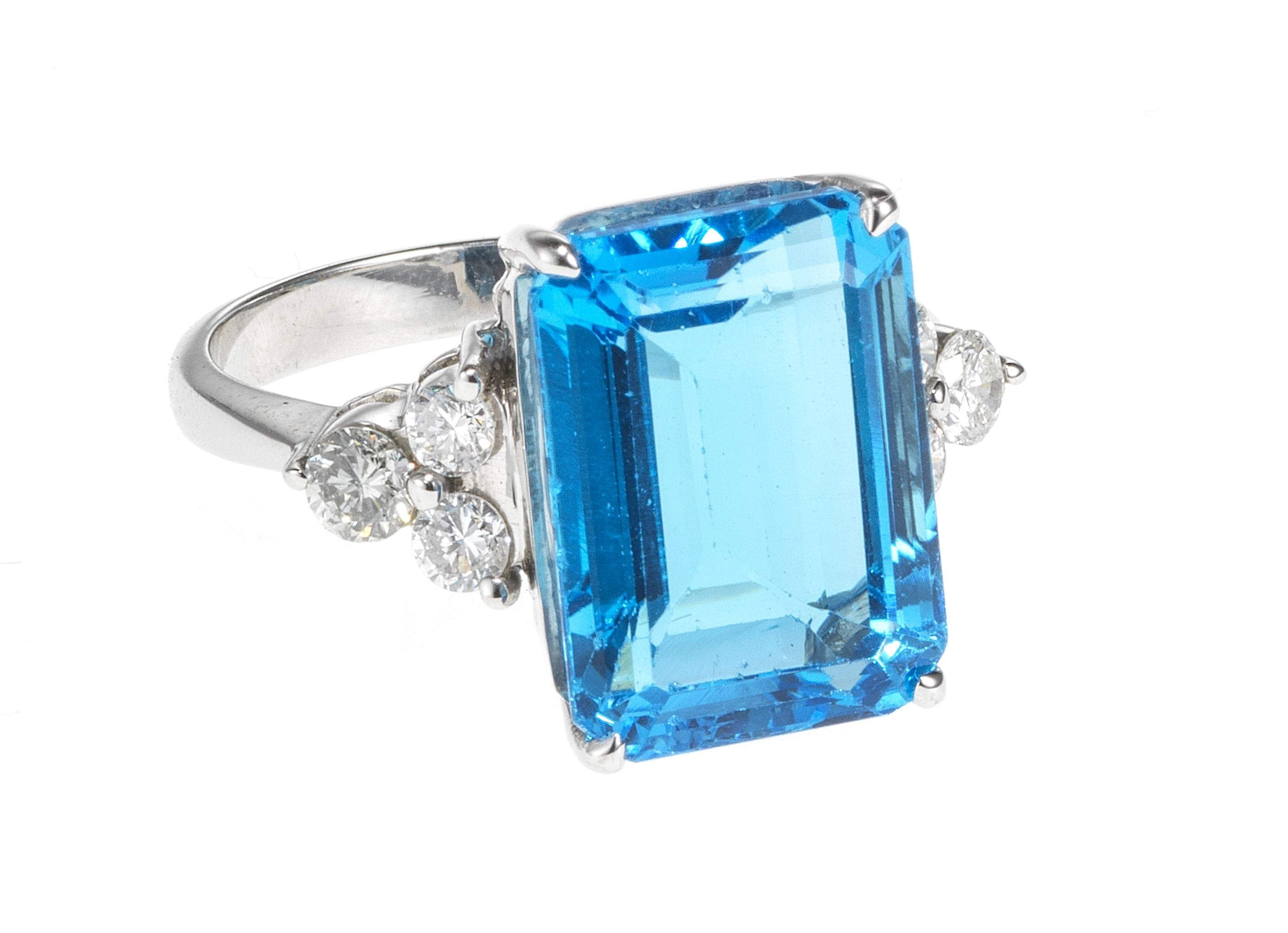 3396. *Bague sertie d'une topaze bleue taille émeraude (env. 9,8 ct) épaulée de diamants