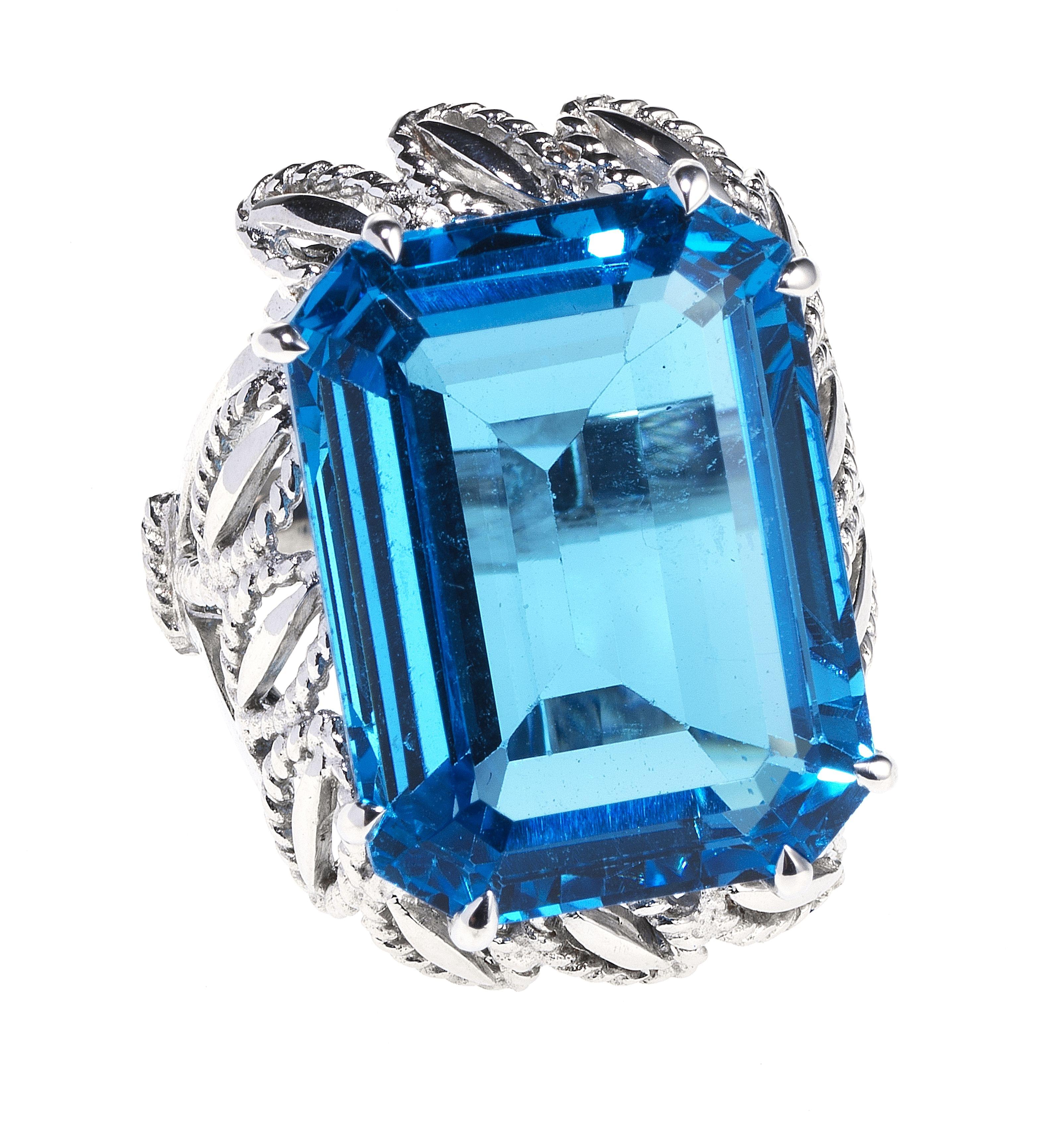 3312. *Bague sertie d'une topaze bleue taille rectangle (env. 25 ct) sur une monture ajourée stylisée