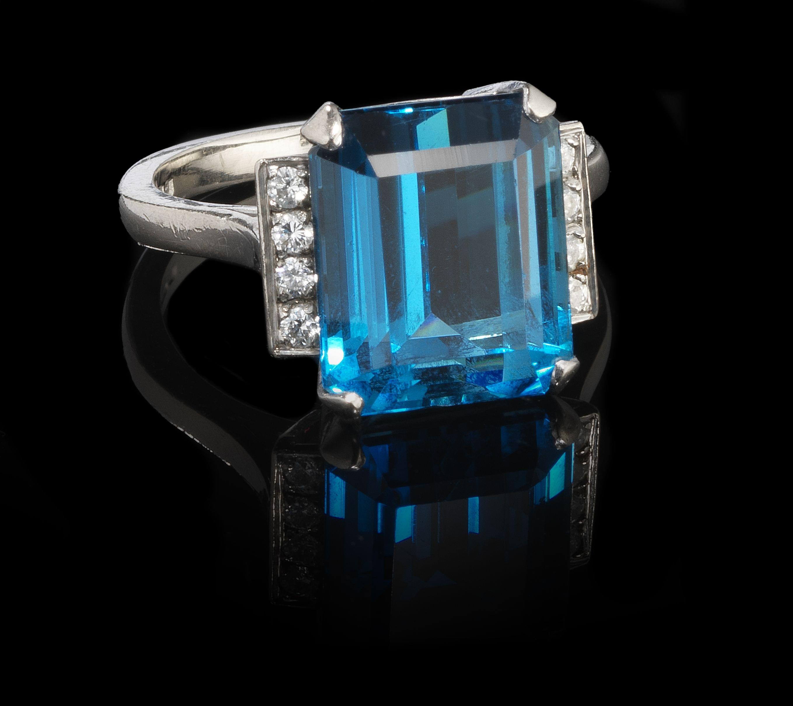 3096. Bague sertie d'une topaze bleue taille rectangle (env. 7 ct) épaulée de deux lignes de diamants