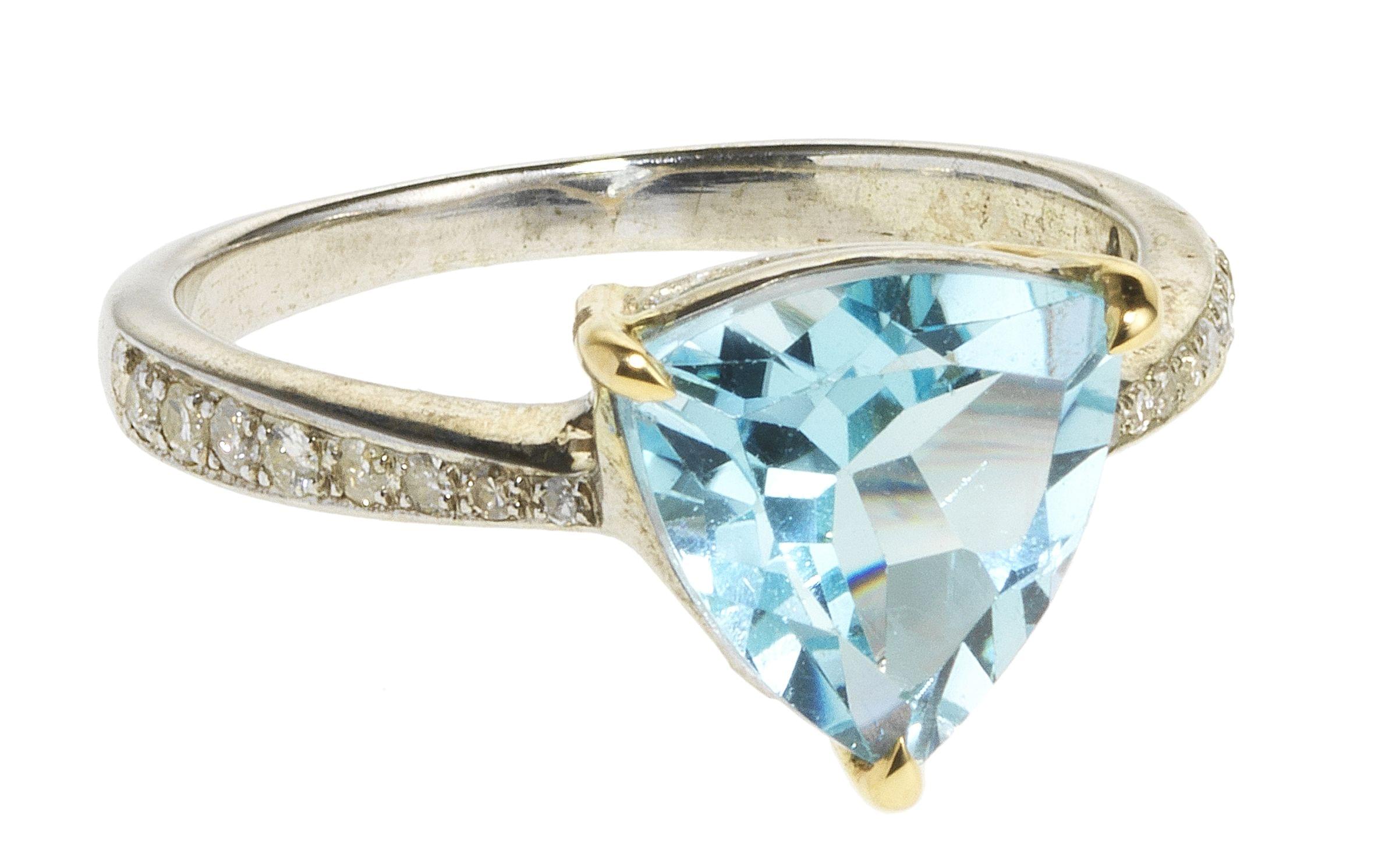 3247. *Bague sertie d'une topaze bleue taille troïda épaulée de deux lignes de diamants