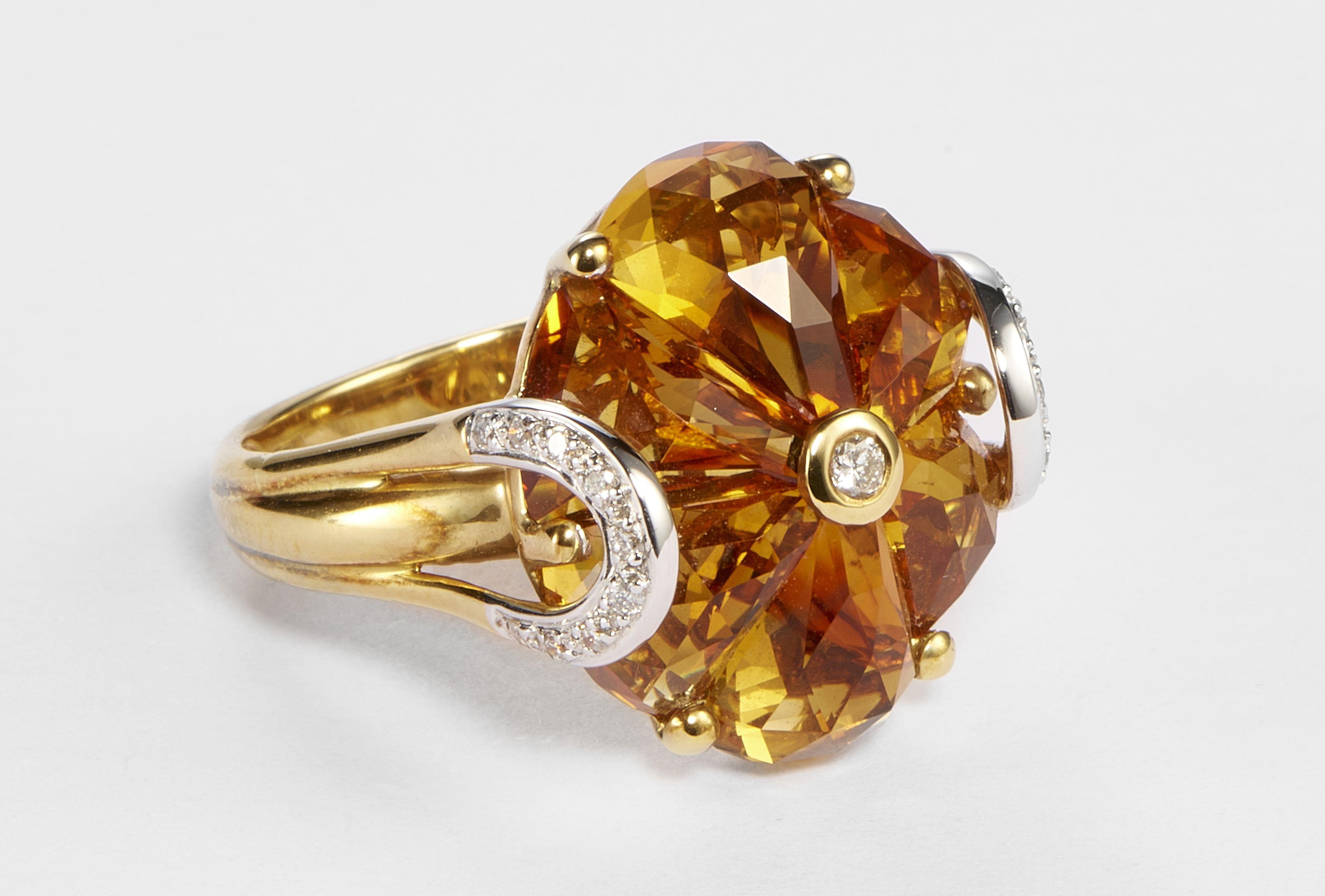 3221. Bague sertie de citrines taille fantaisie facettées centrées d'un diamant et épaulées de deux motifs sertis de diamants