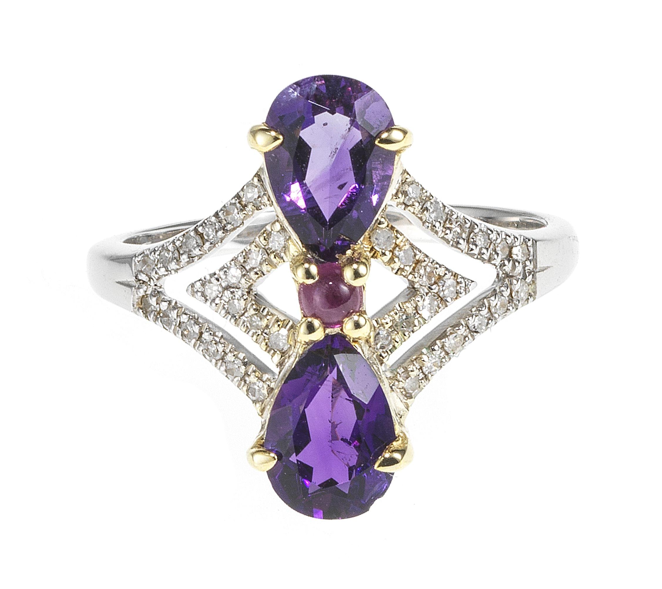 3196. *Bague sertie de deux améthystes taille poire (env. 1 ct) encadrant un rubis taille cabochon