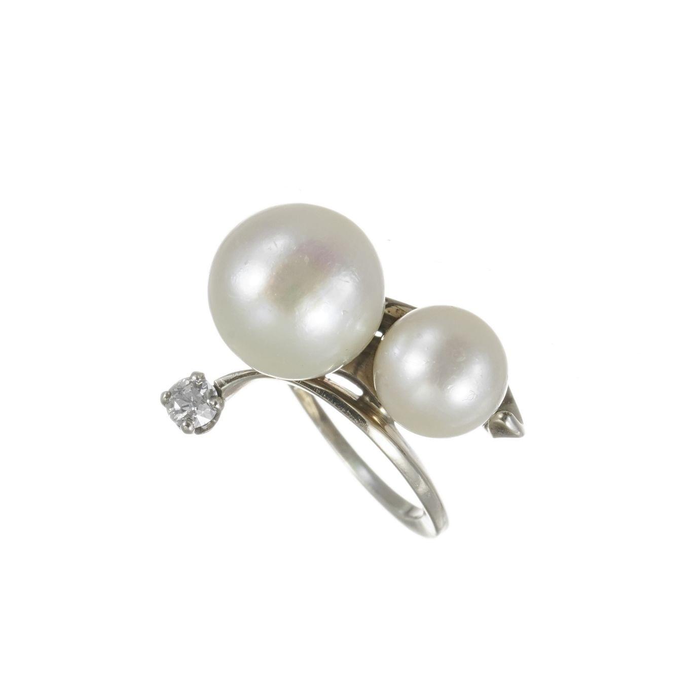 3140. Bague sertie de deux perles rehaussées d'un diamant