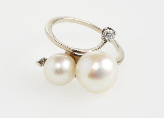 3289. Bague sertie de deux perles rehaussées d'un diamant