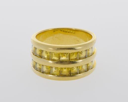97. Bague sertie de deux rangs de saphirs jaunes calibrés