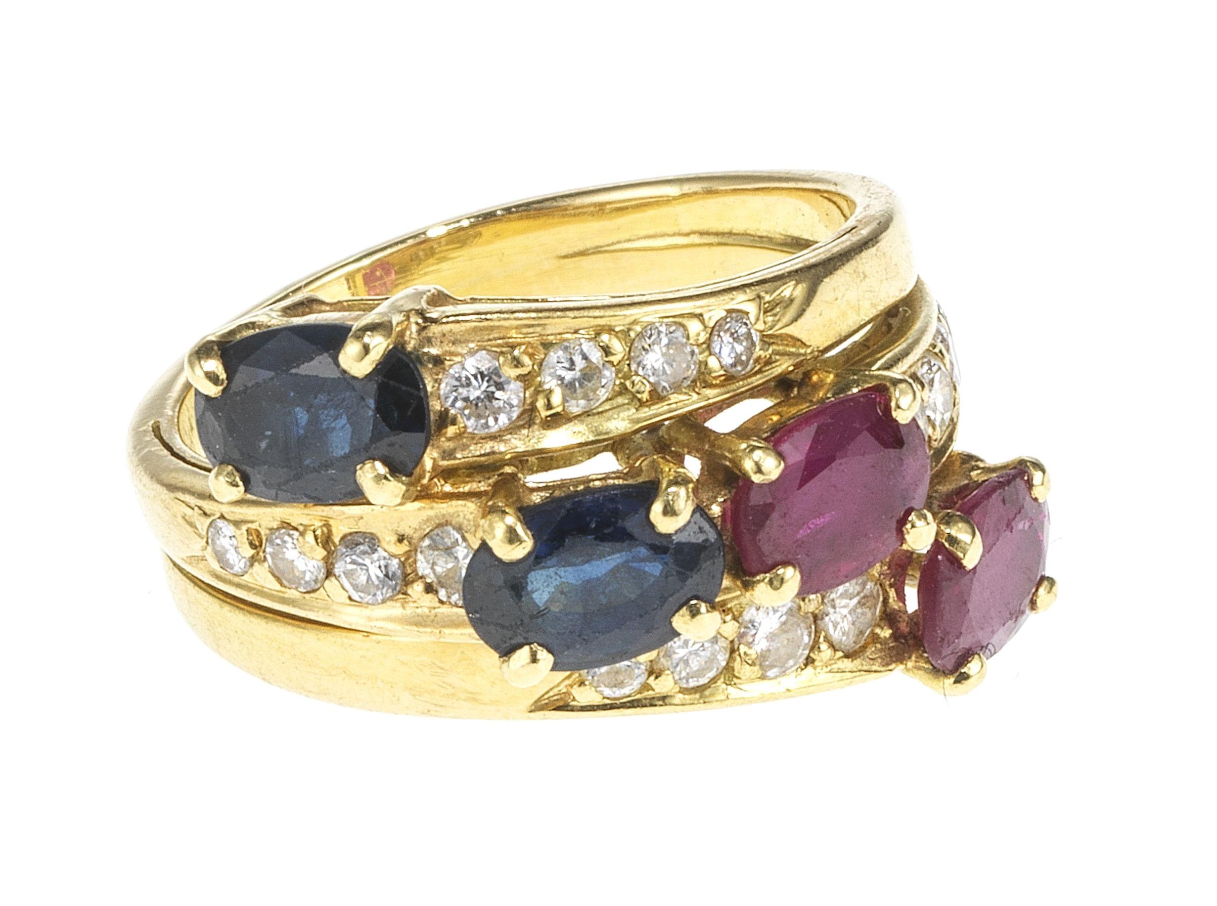 3293. *Bague sertie de deux rubis et deux saphirs taille ovale, rehaussés de lignes de diamants