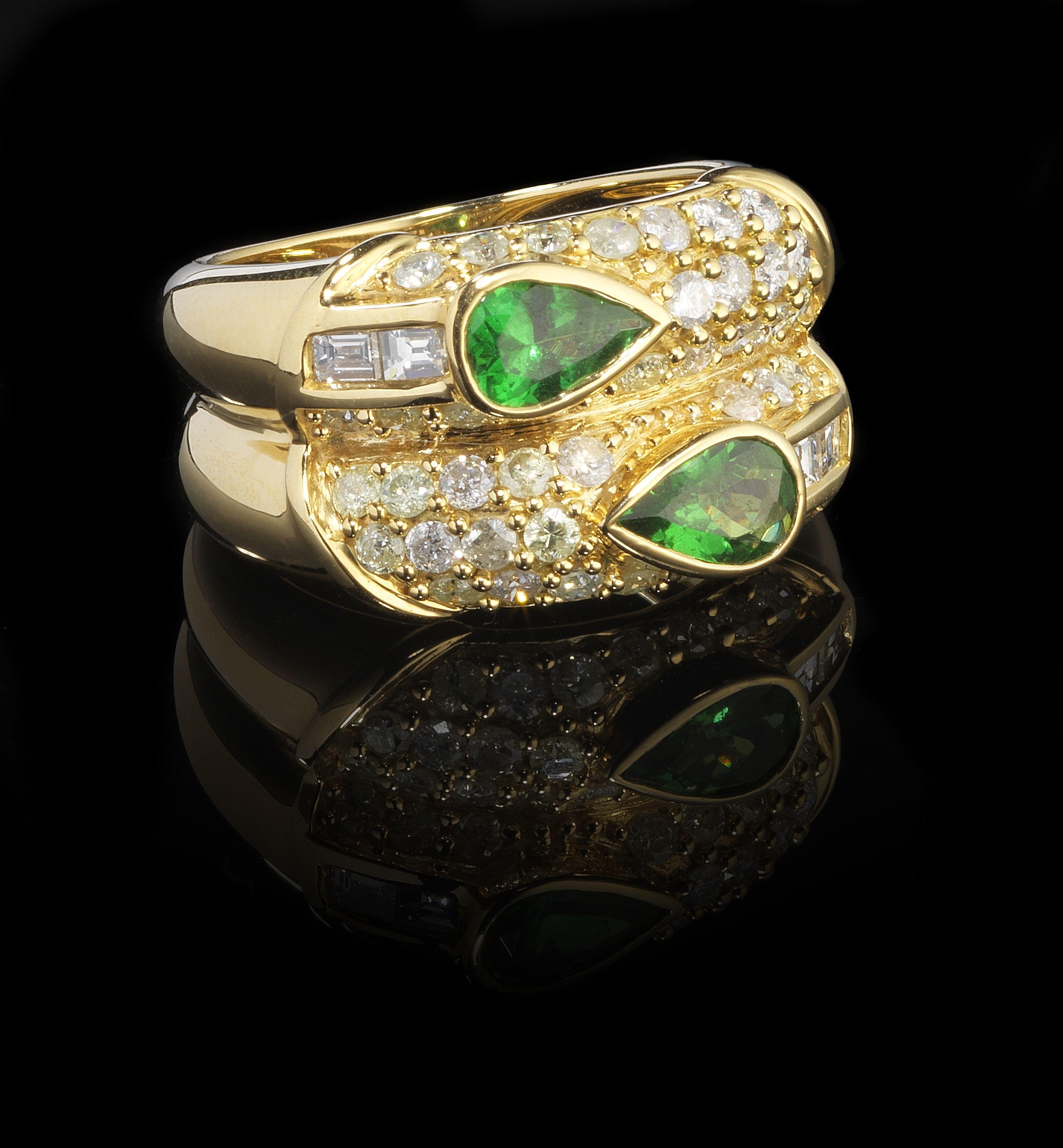 3479. Bague sertie de deux tsavorites taille poire (total env. 0,7 ct) et pavée de diamants (total env. 1 ct)