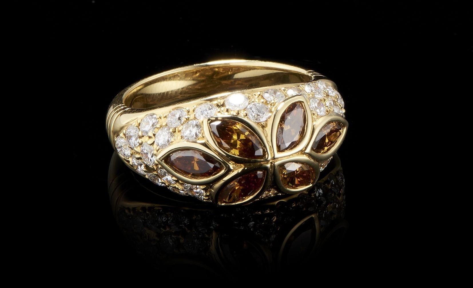 129. Bague sertie de diamants cognac taille marquise entourés d'un pavage de diamants (env. 1 ct)