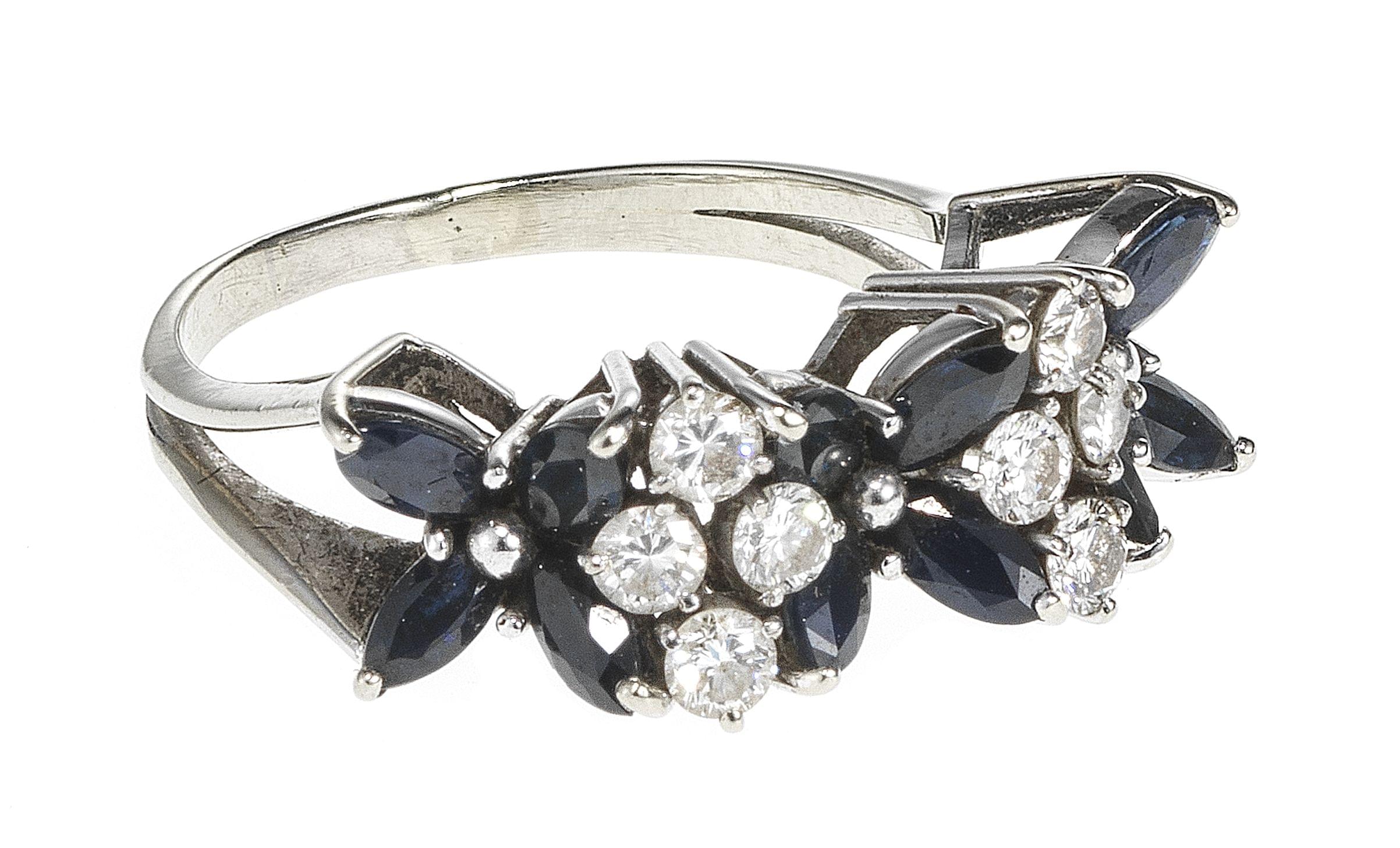 3221. Bague sertie de saphirs taille marquise formant trois fleurs rehaussées de diamants