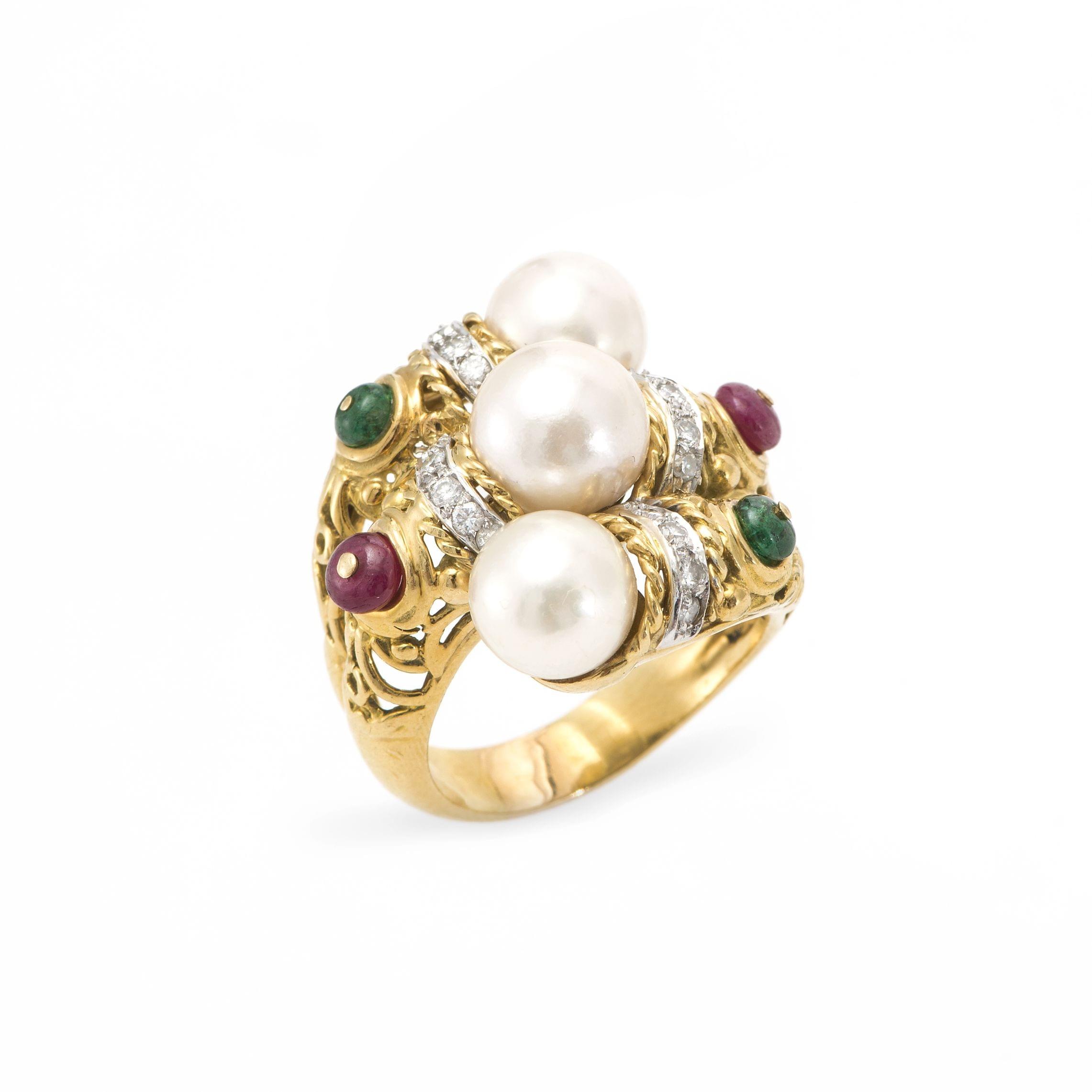 98. Bague sertie de trois perles blanches, de diamants taille brillants et de rubis et émeraudes cabochons