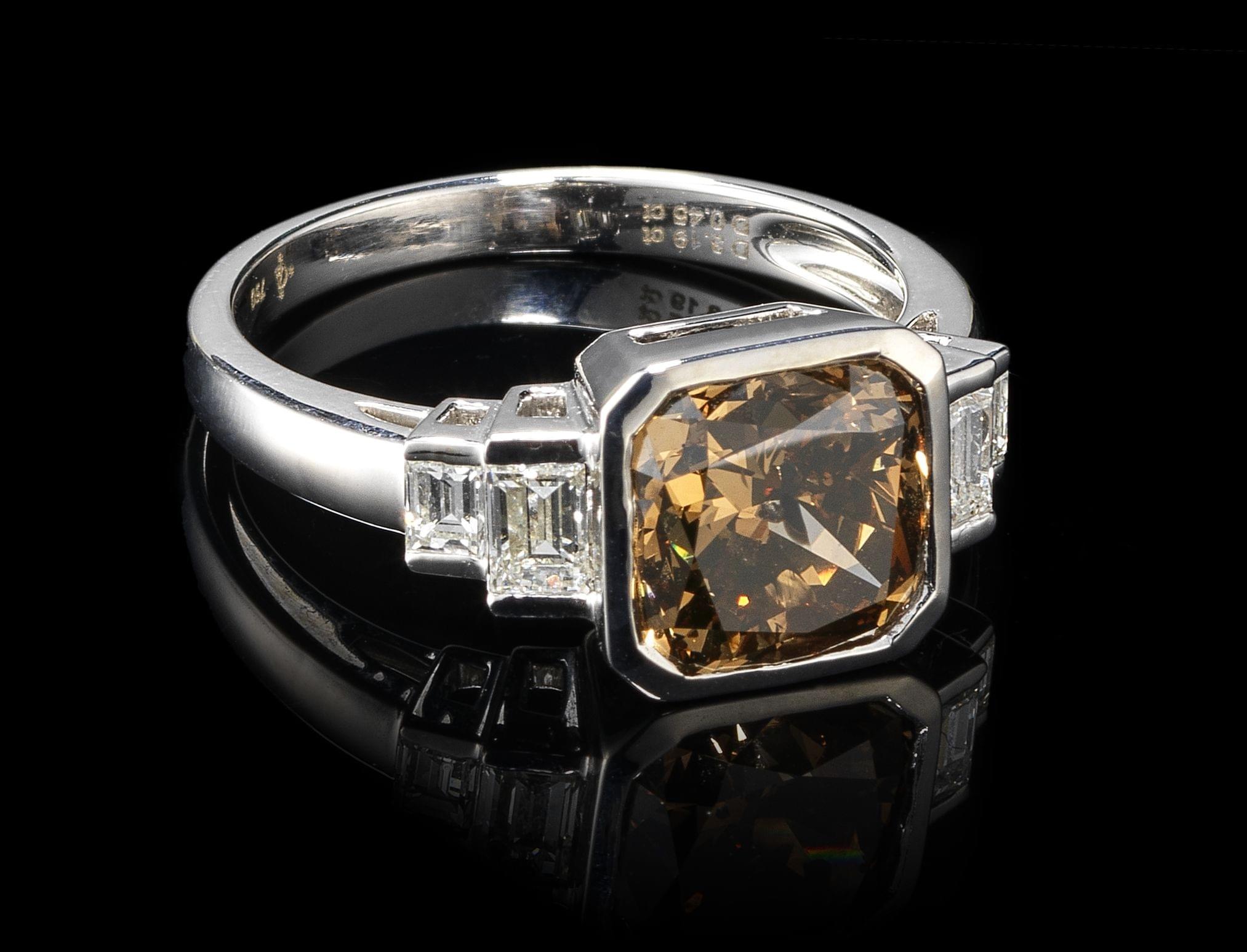 296. *Bague sertie d'un diamant cognac taille coussin (3,18 ct) épaulé de diamants taille baguette (env. 0,45 ct)