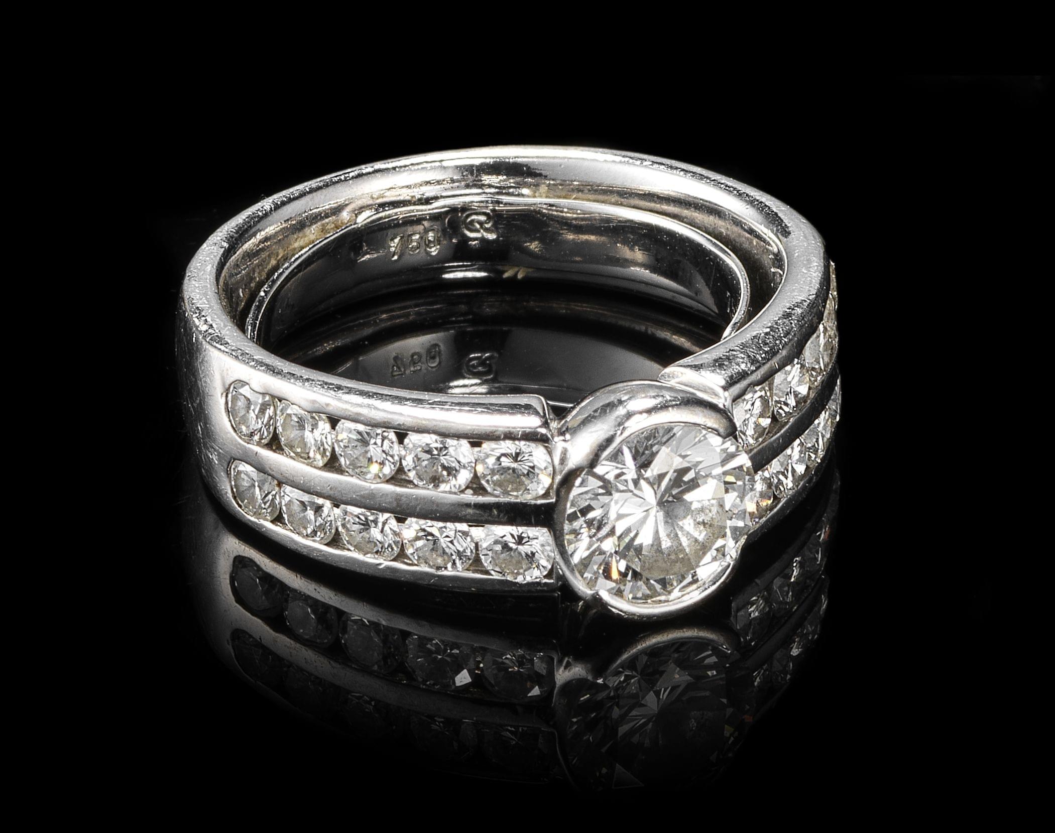 290. Bague sertie d'un diamant (env. 0,8 ct) épaulé de deux lignes de diamants