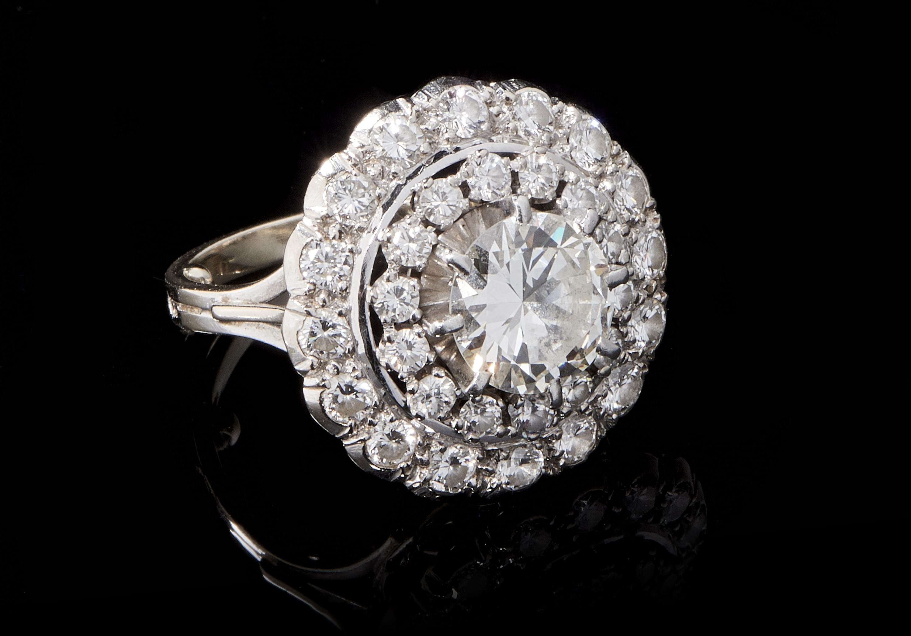732. Bague sertie d'un diamant (env. 2,1 ct) dans un double entourage de diamants
