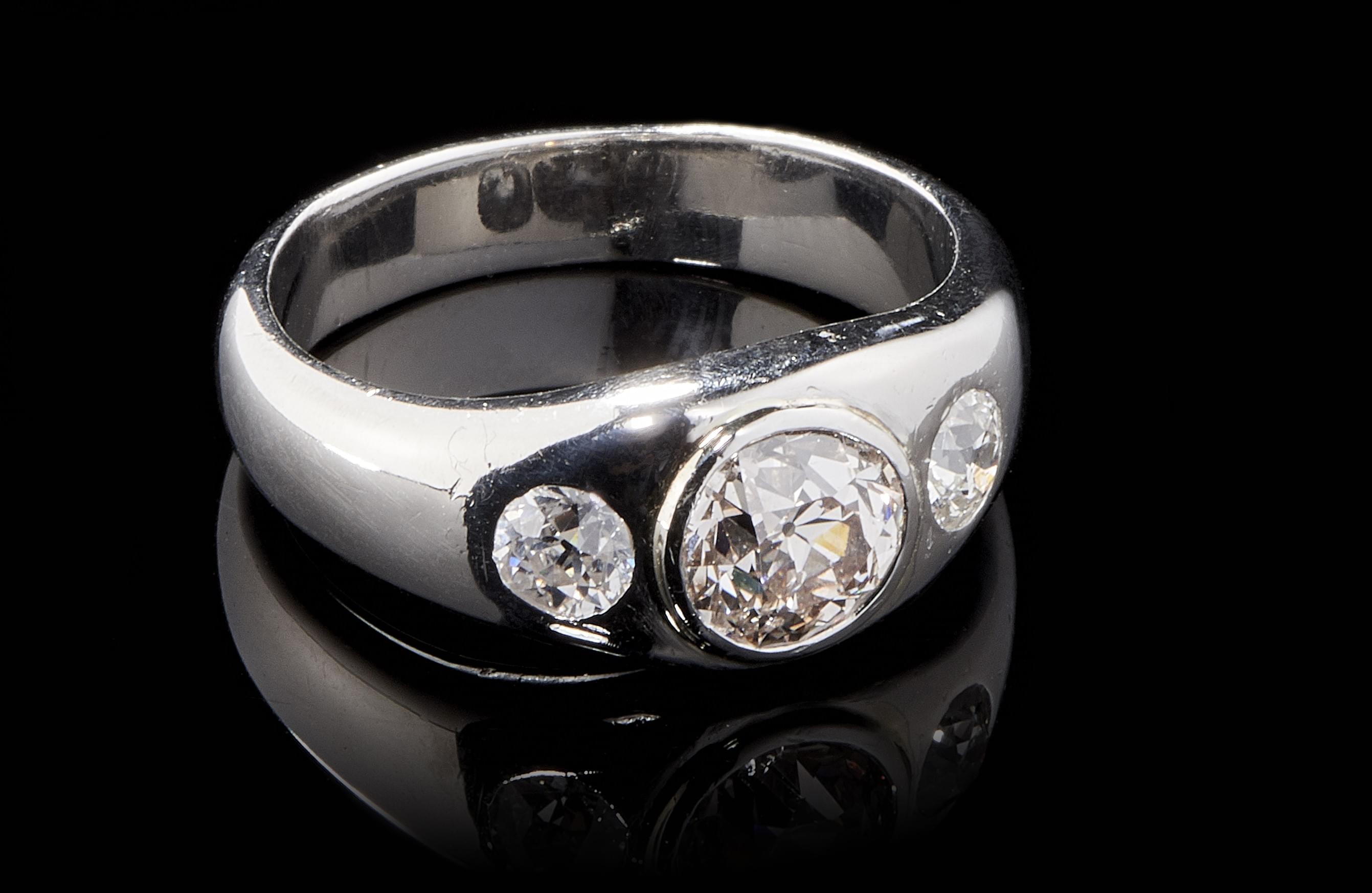726. Bague sertie d'un diamant taille ancienne (env. 1,4 ct) épaulé de deux diamants taille ancienne (total env. 0,6 ct)