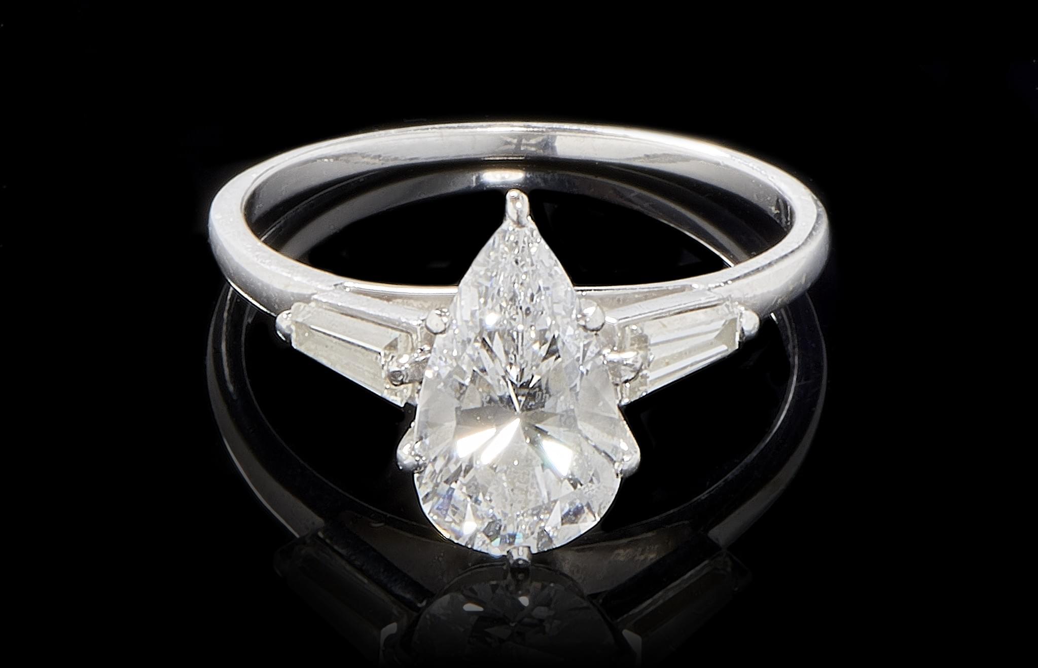 1077. Bague sertie d'un diamant taille poire (env. 1,9 ct) épaulé de deux diamants trapèze