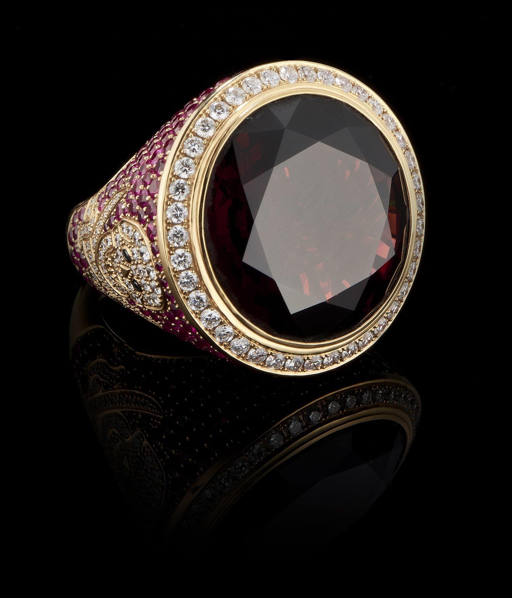 136. Bague sertie d'un grenat taille brillant entouré de diamants sur une monture décorée de têtes de mort et pavée de rubis