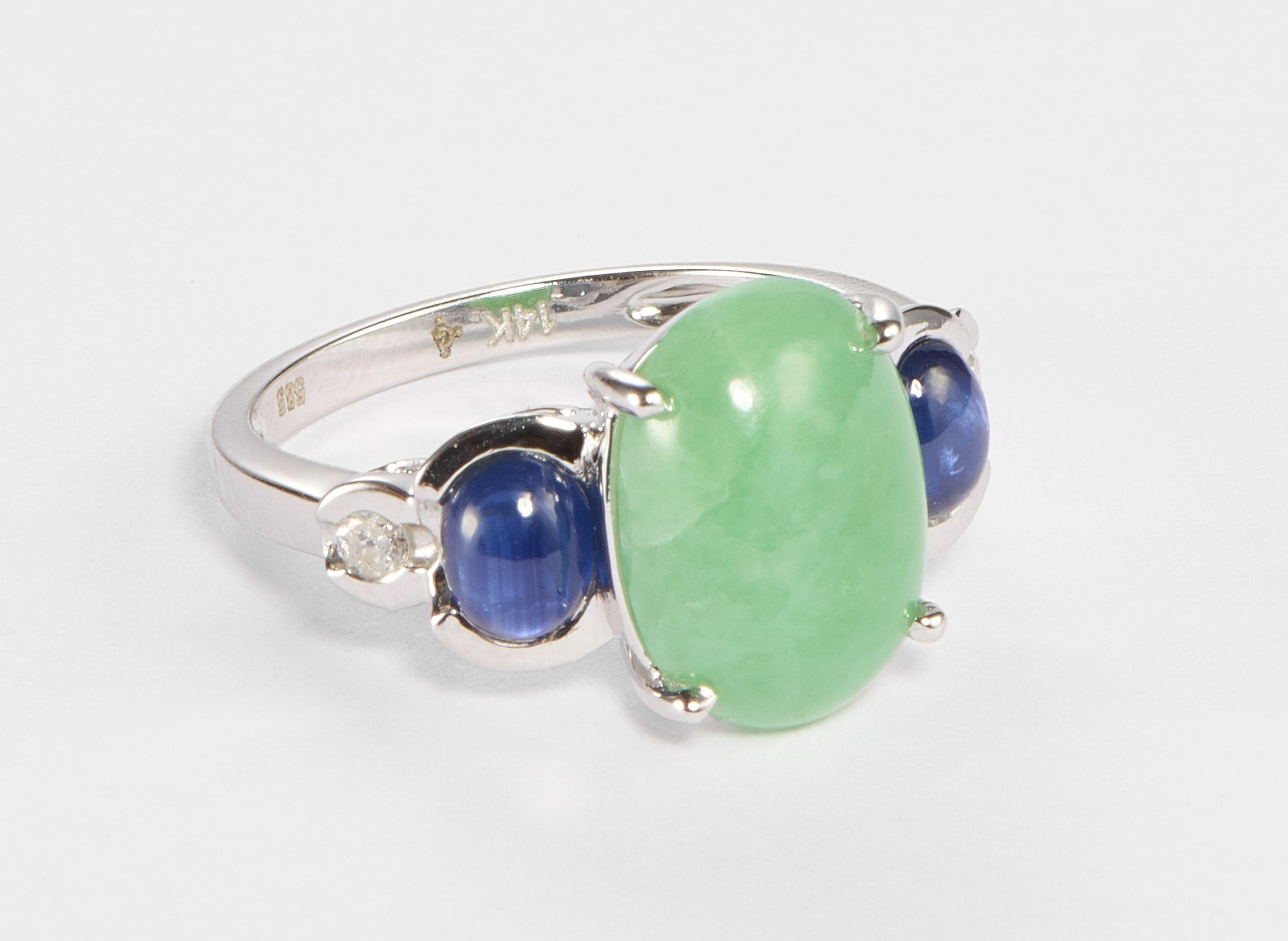 3254. *Bague sertie d'un jade taille cabochon ovale épaulé de saphirs cabochon et de diamants taille brillant