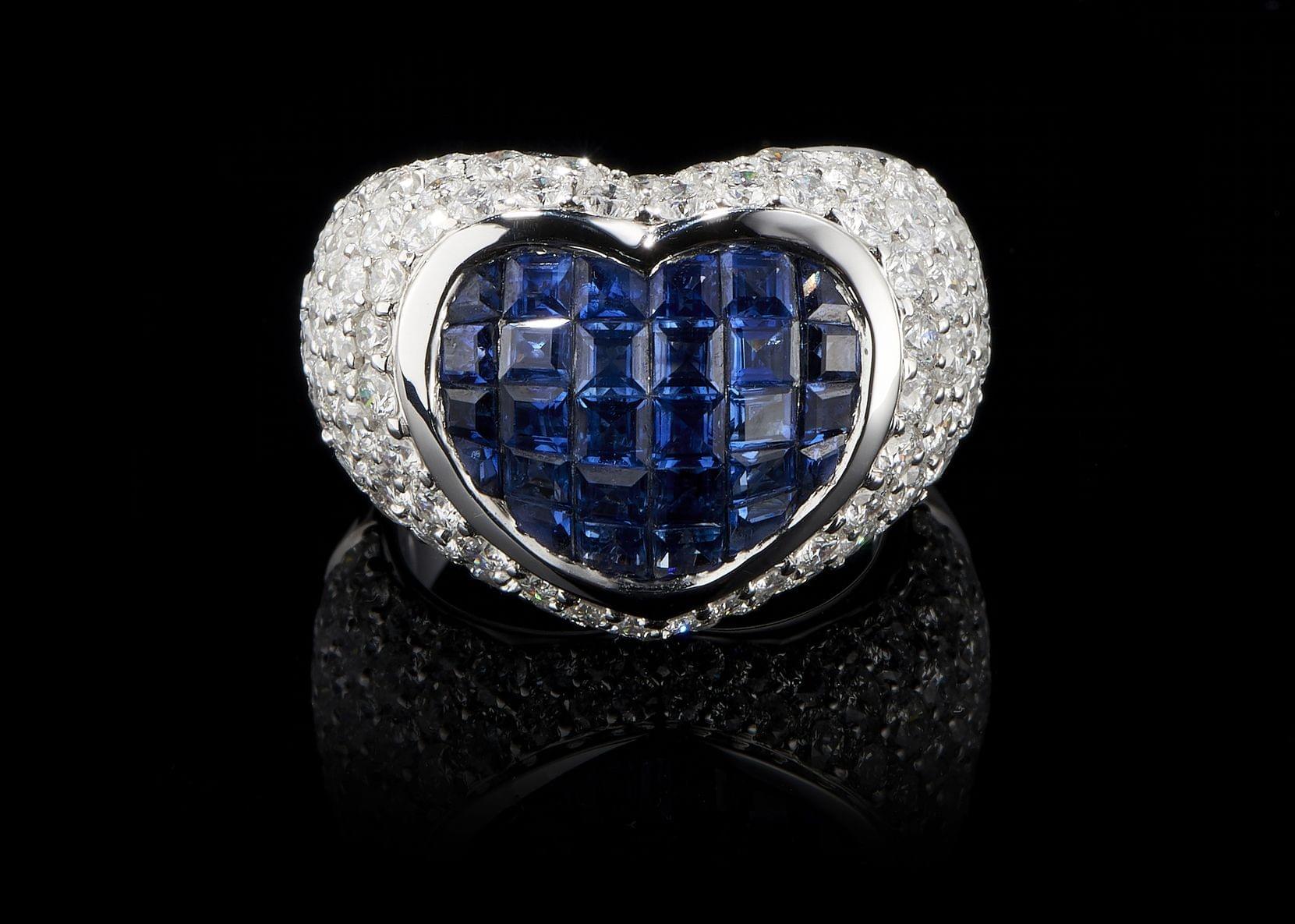 169. Bague sertie d'un pavage de saphir en serti invisible formant un motif de cœur (env. 6 ct) dans un pavage de diamants (env. 4,5 ct)