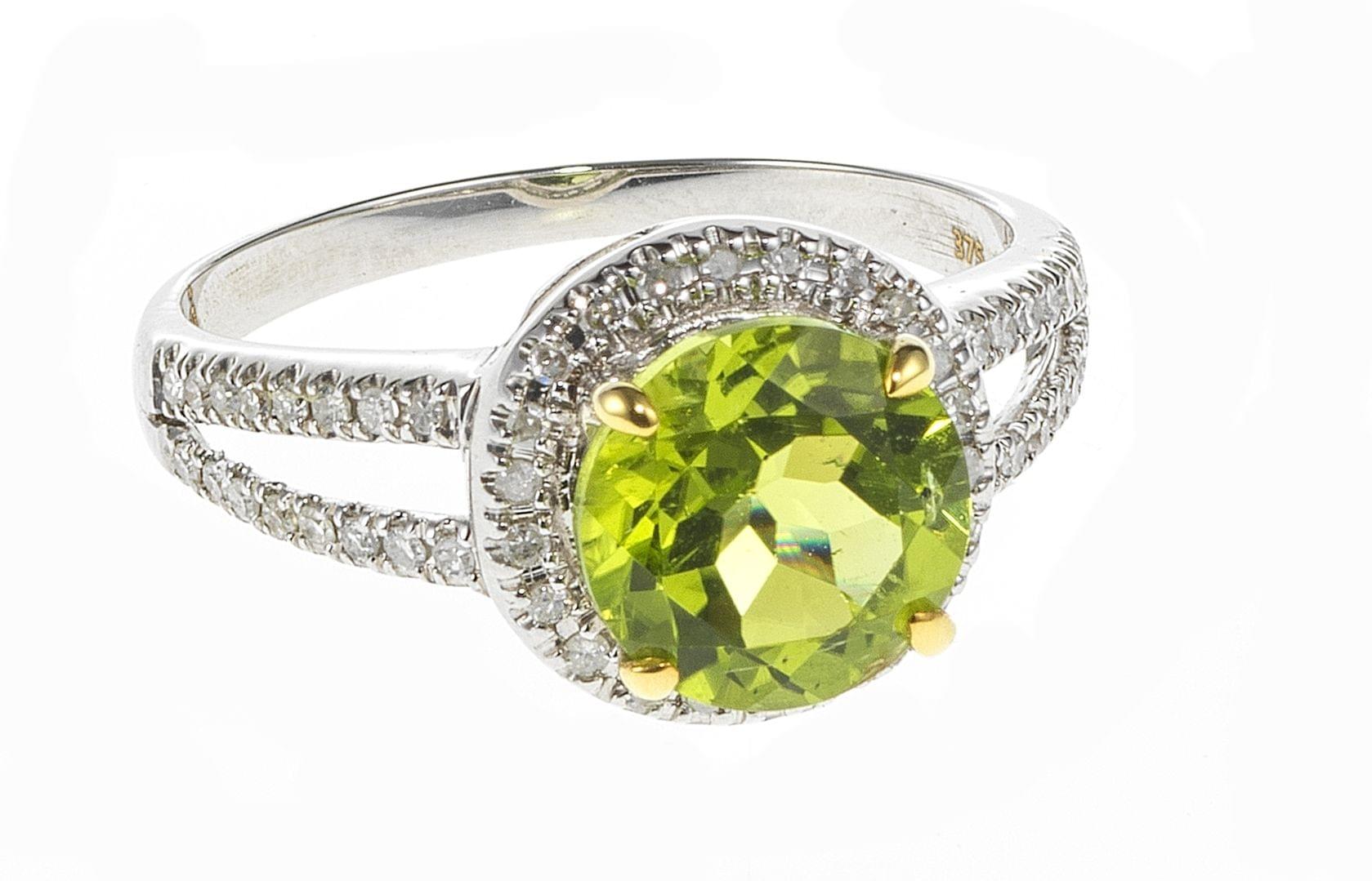 3181. *Bague sertie d'un péridot taille brillant (env. 1,5 ct) sur une monture ajourée semi-pavée de diamants