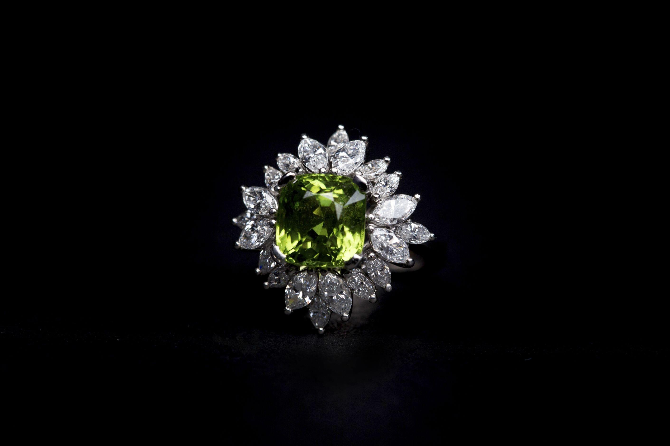 845. Bague sertie d'un péridot taille coussin (env. 4,3 ct) entouré de diamants taille marquise (env. 2 ct)