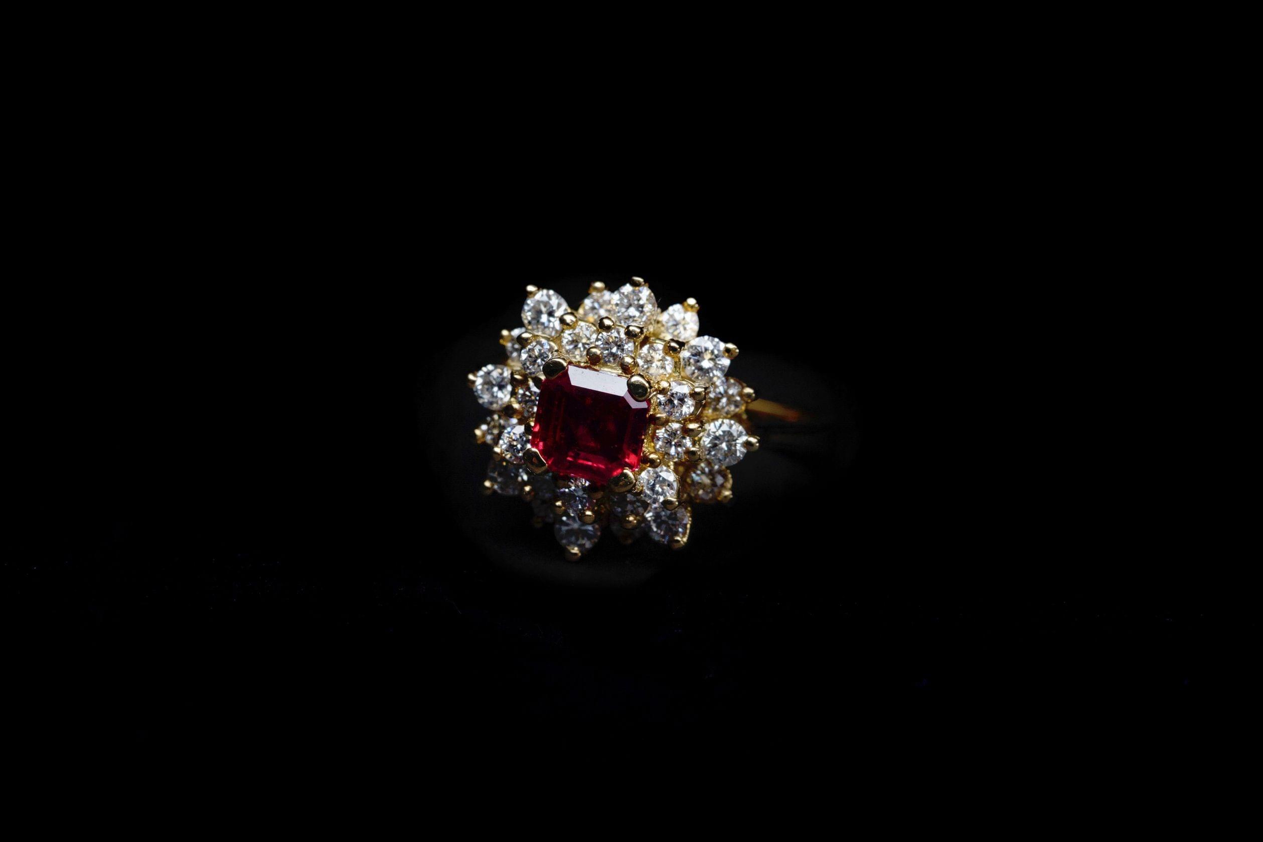 818. Bague sertie d'un rubis taille carré entouré de diamants