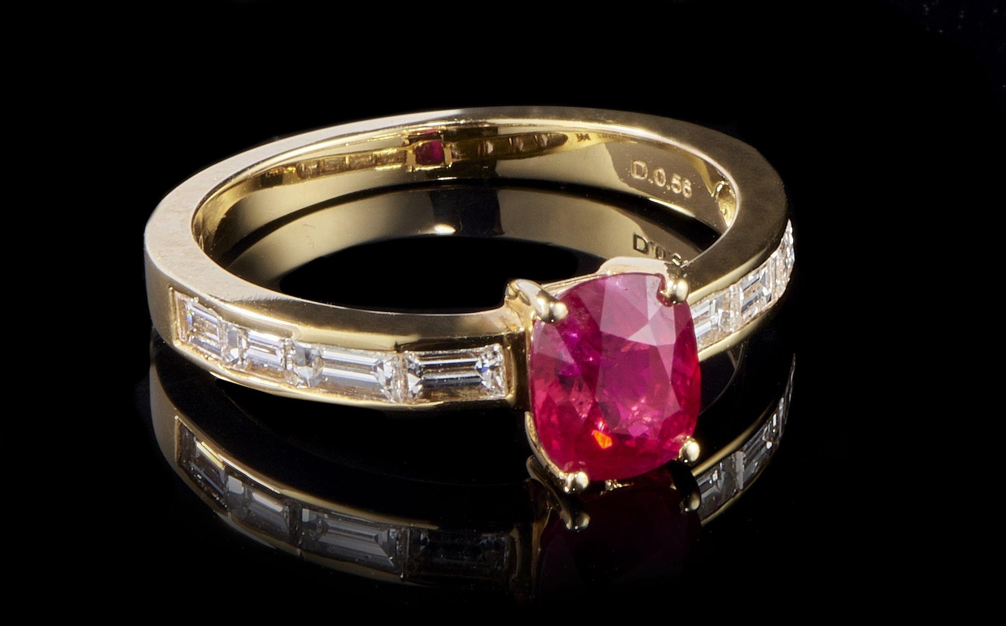 99. Bague sertie d'un rubis taille coussin ovale (env. 1,3 ct) épaulé de diamants taille baguette