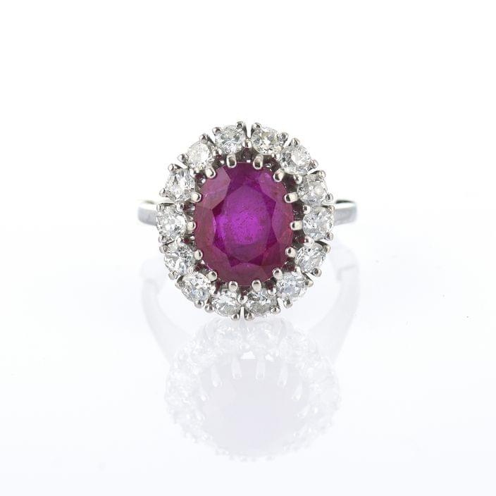 77. Bague sertie d'un rubis taille ovale entouré de diamants taille brillant