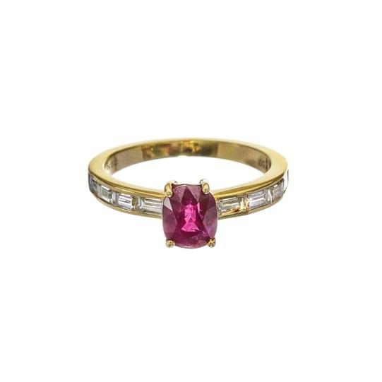 249. Bague sertie d'un rubis taille ovale (env. 1 ct) sur un anneau semi-pavé de diamants taille baguette