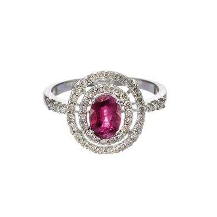 285. Bague sertie d'un rubis taille ovale (env. 1.1 ct) dans un double entourage de diamants