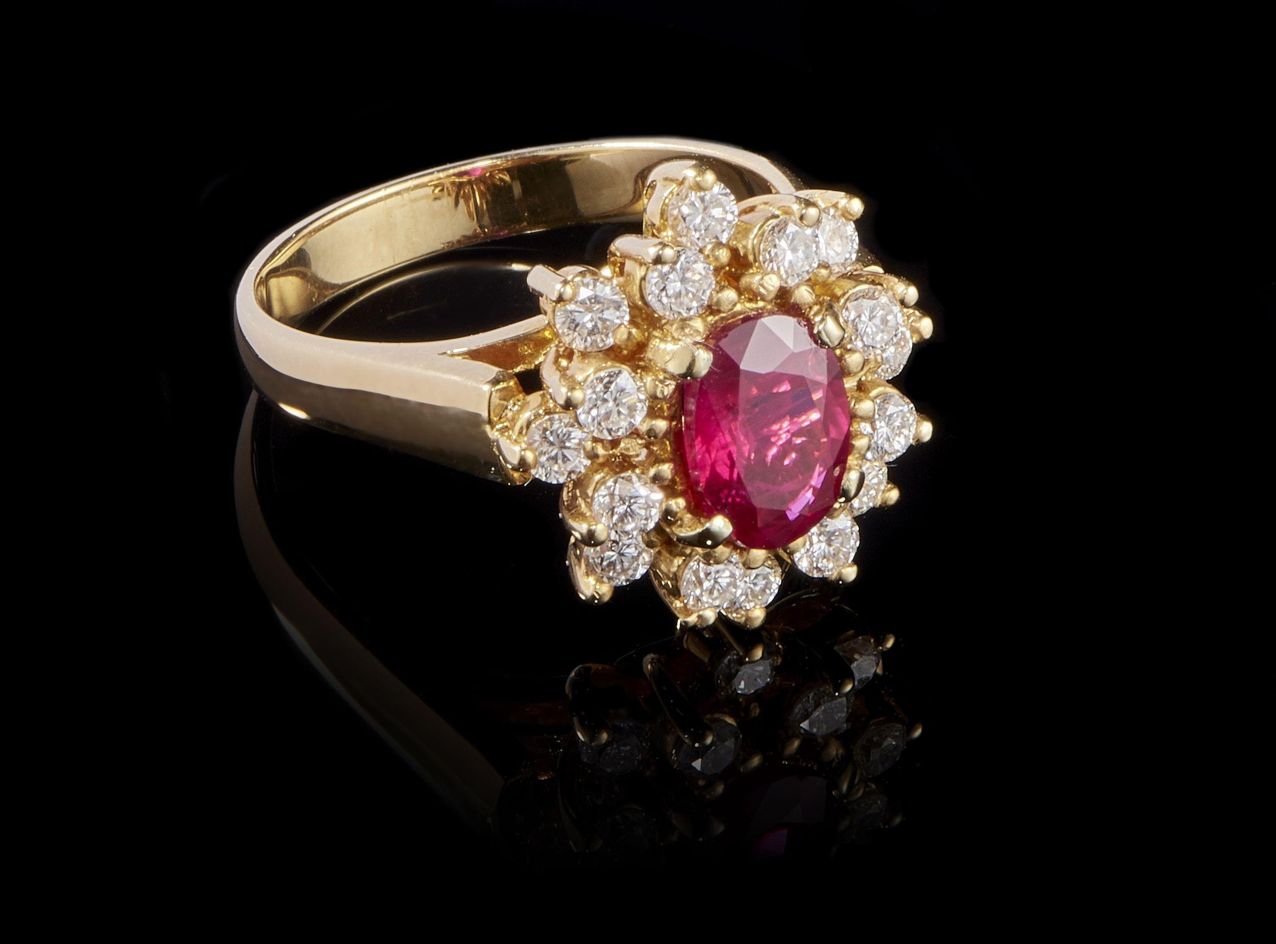 100. Bague sertie d'un rubis taille ovale (env. 1,3 ct) entouré de diamants (env. 0,7 ct)