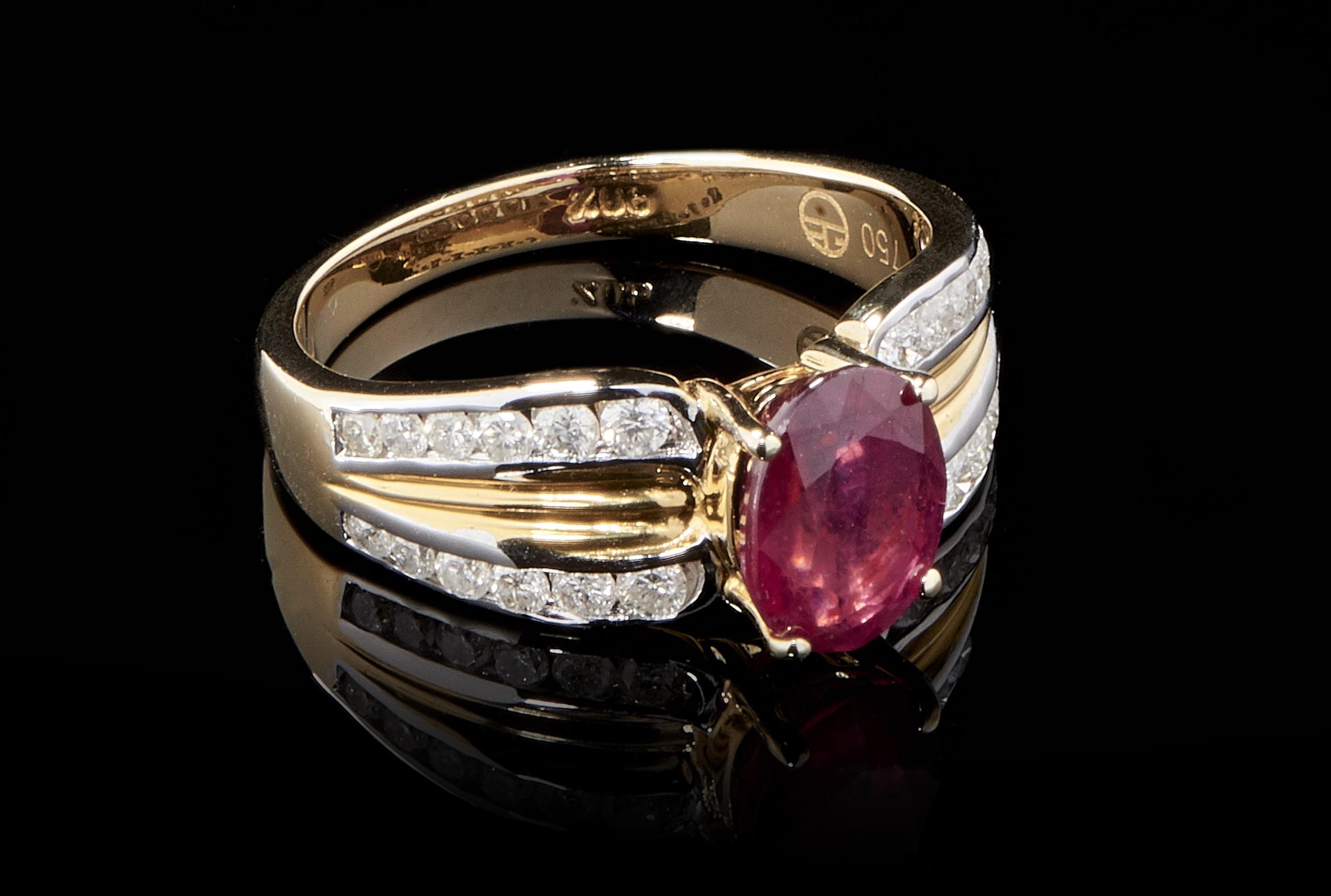 3279. Bague sertie d'un rubis taille ovale (env. 1,4 ct) épaulée de deux lignes de diamants