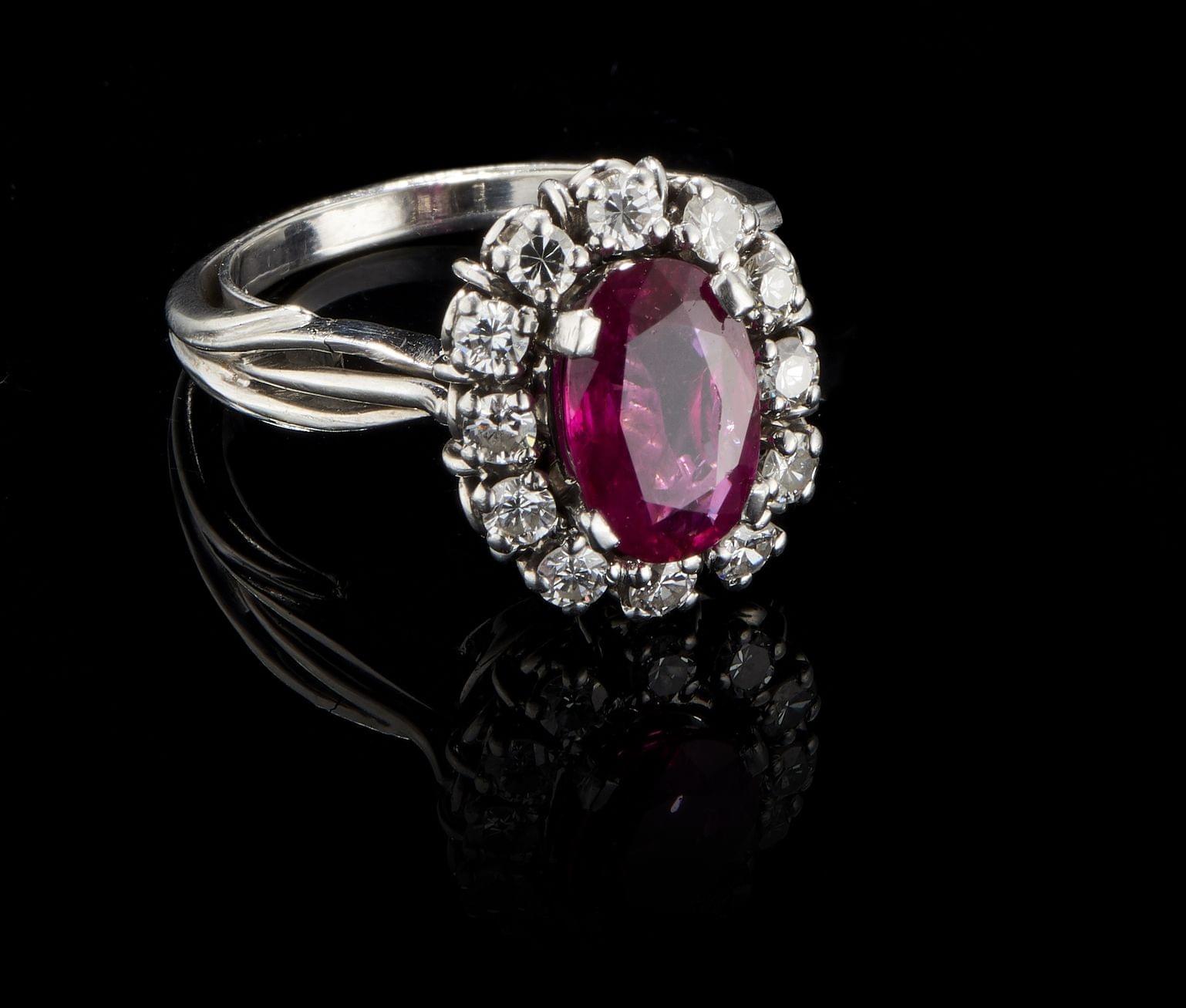 174. Bague sertie d'un rubis taille ovale (env. 1,7 ct) entouré de diamants (env. 0,5 ct)