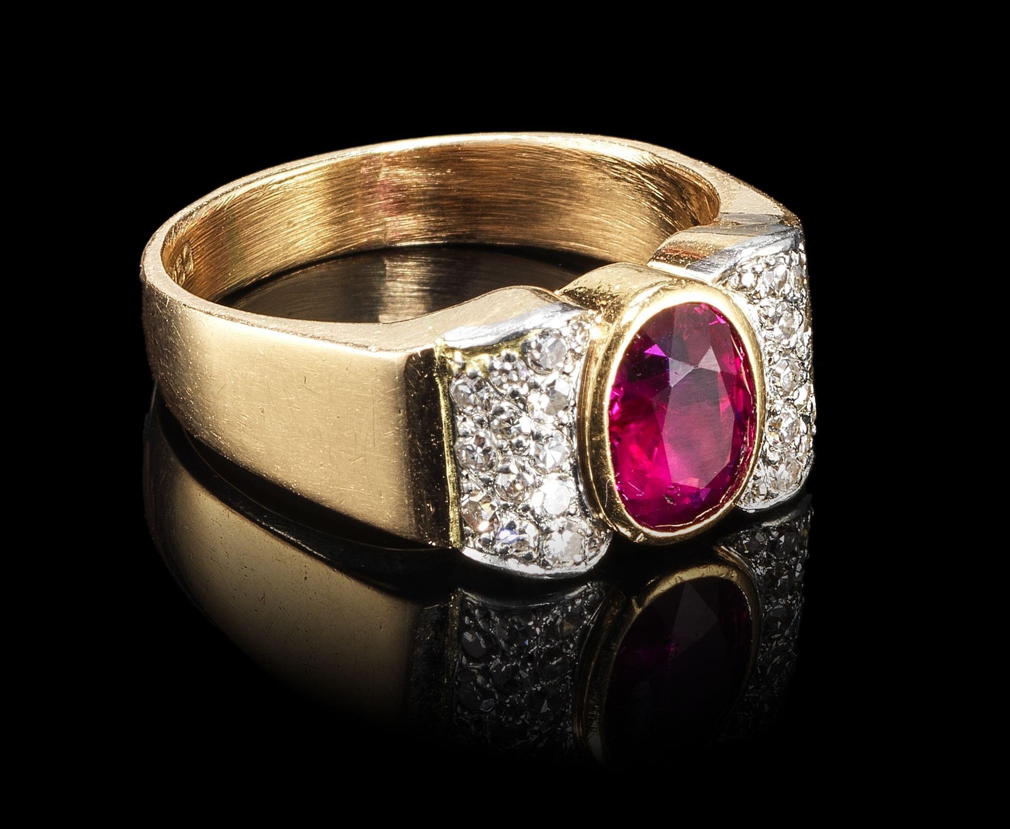 271. Bague sertie d'un rubis taille ovale (env. 1,7 ct) épaulé de pavages de diamants