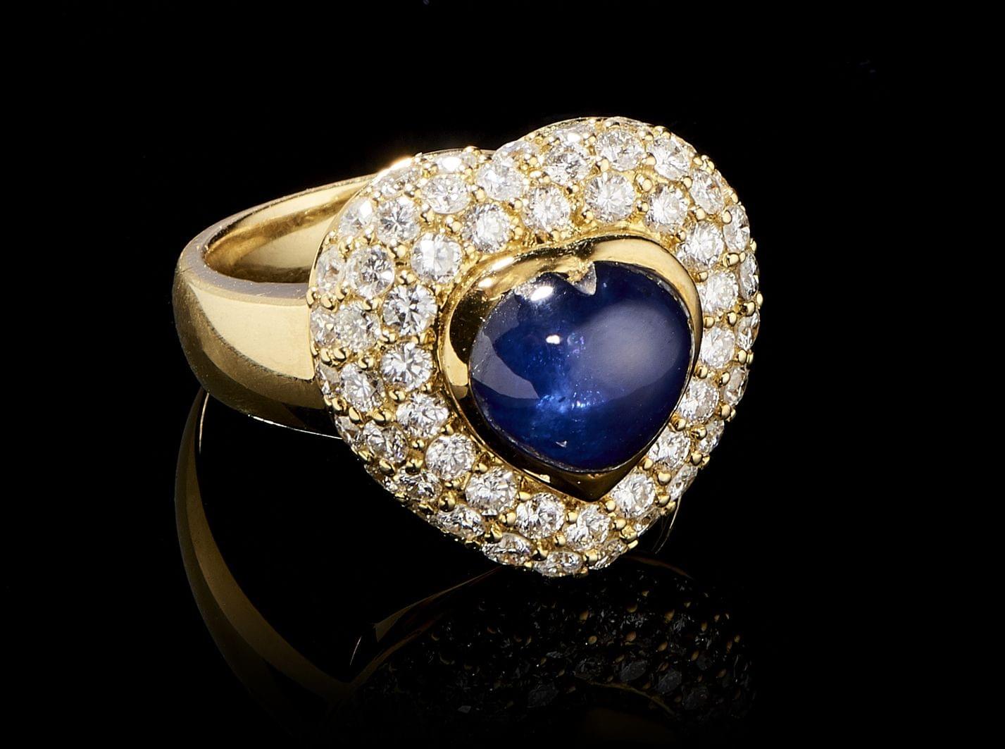 101. Bague sertie d'un saphir cabochon de forme cœur entouré d'un pavage de diamants (env. 0,8 ct)
